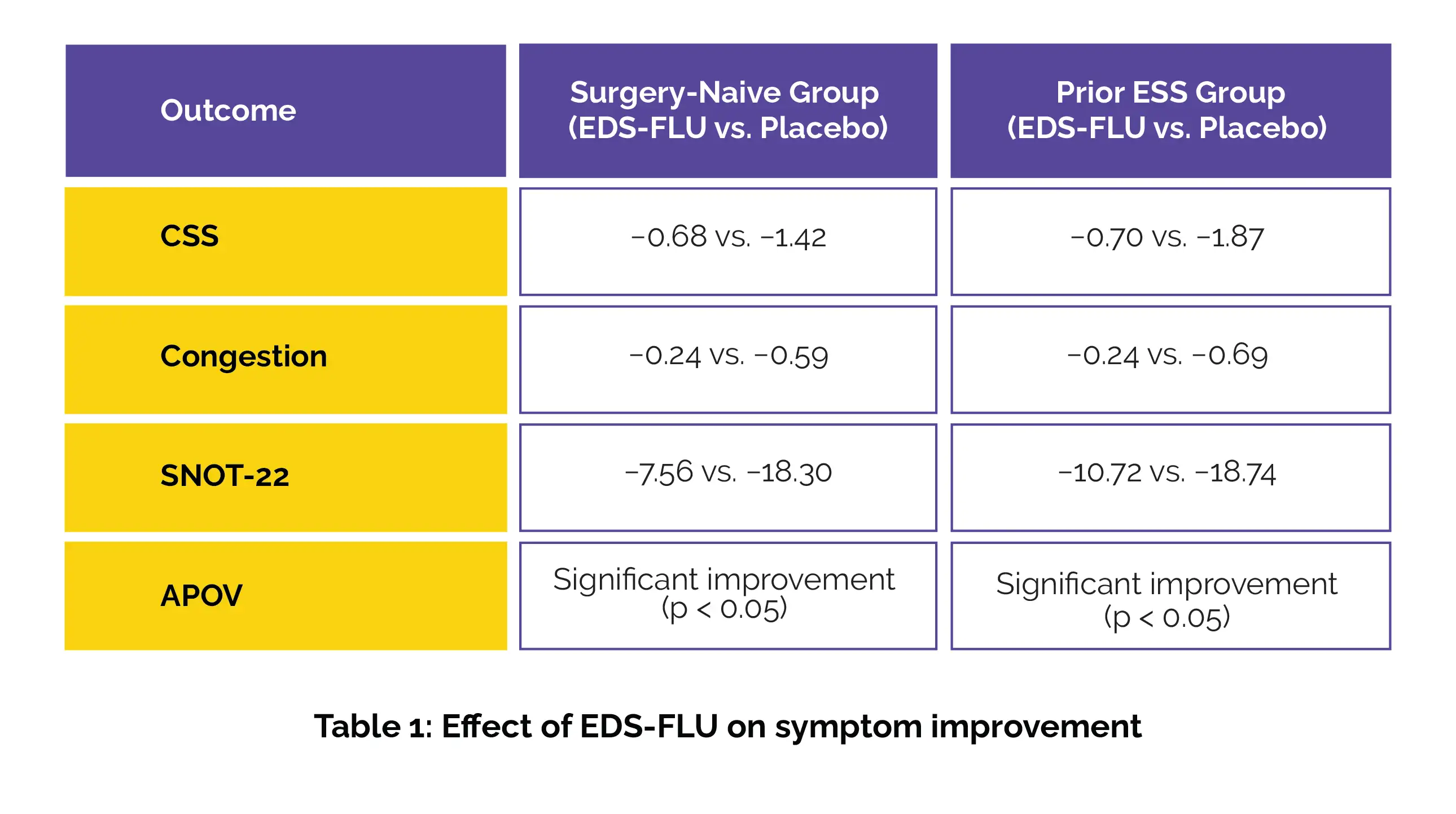 The endpoints ascertained were combined symptom score (CSS), congestion score [weeks 4, 8, 12], average of percentages of opacified volume (APOV) of ethmoid/maxillary sinuses on computed tomography, and sinonasal outcome test 22 (SNOT-22) total score [week 24]. EDS-FLU remarkably improved symptoms versus placebo (p < 0.05) in those with moderate–severe disease (mean CSS = 5.8, APOV = 67.2%). Surgery-naive and prior ESS groups illustrated improvements in CSS, congestion, SNOT-22, and APOV, with no vital differences between surgery subgroups (Table 1).