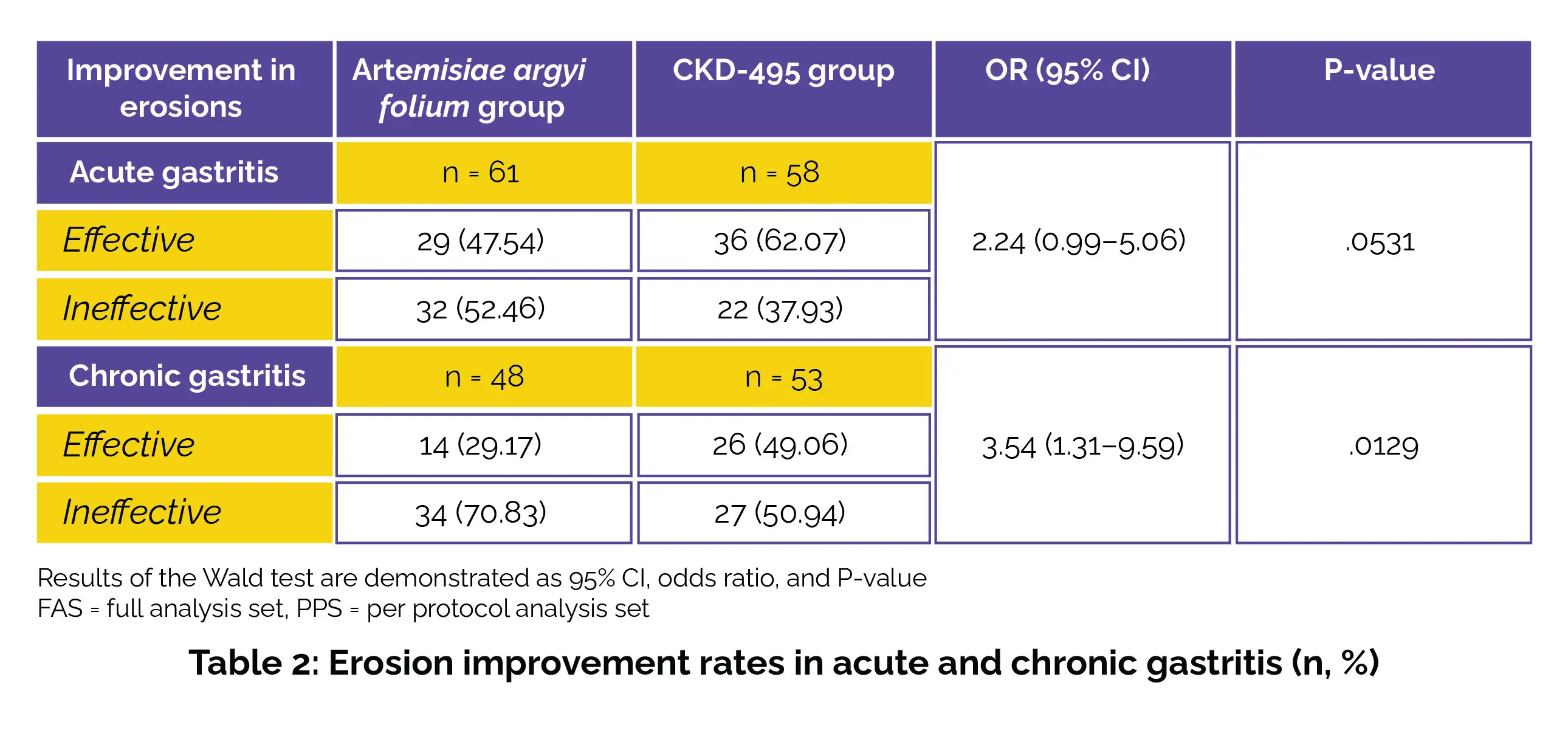As found, subjects in the CKD-495 cohort exhibited better improvement rates compared to those in the AAF group in terms of oedema (OR, 2.54; 95% CI, 0.37–17.38), erosion cure rate (OR, 1.76; 95% CI, 0.98–3.17), haemorrhage (OR, 1.72; 95% CI, 0.57–5.17), redness (OR, 1.40; 95% CI, 0.50–3.86), and self-reported gastrointestinal symptoms (OR, 1.05; 95% CI, 0.58–1.90). Comparable results were noted in the PPS.