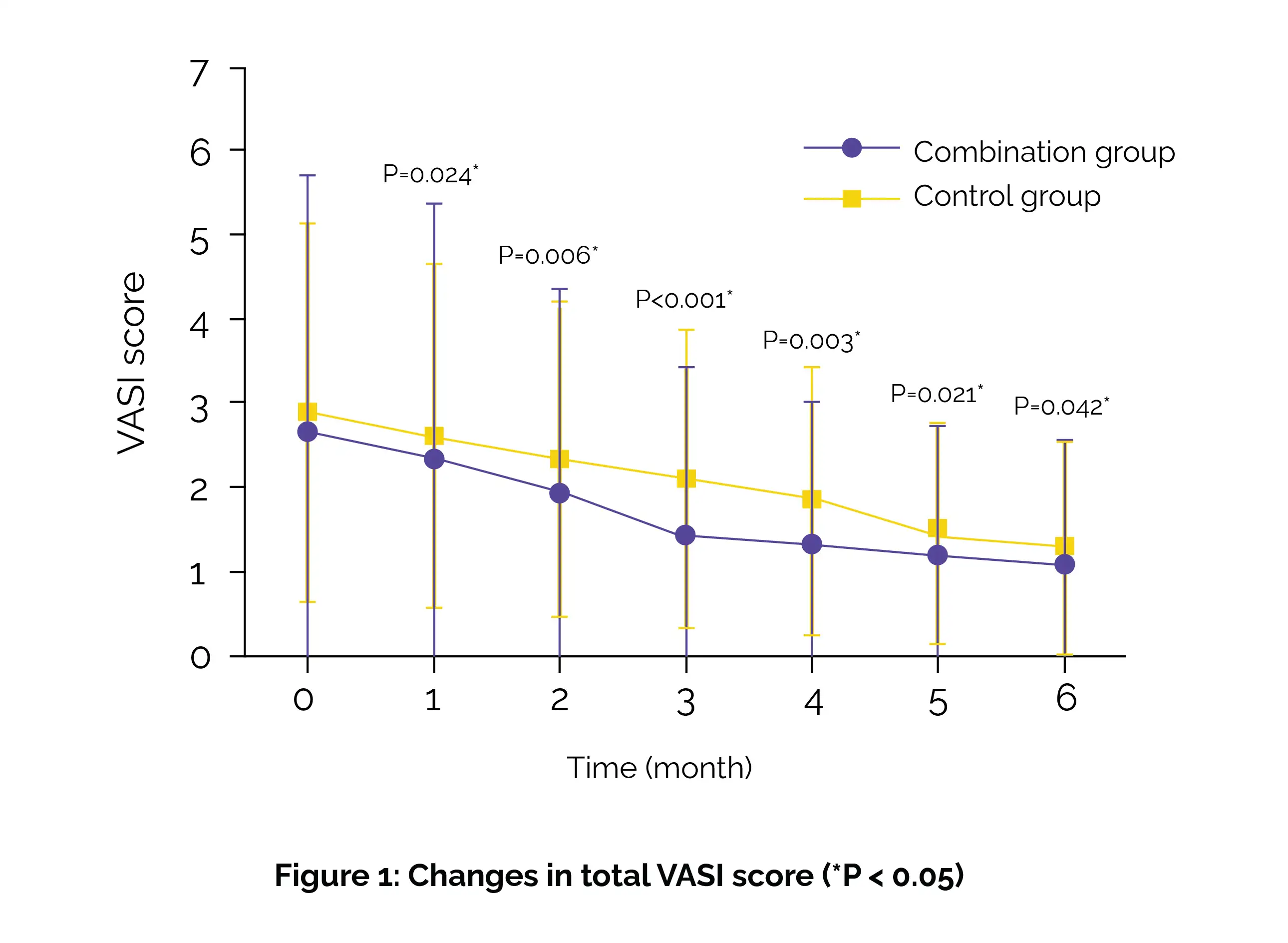 The efficacy was assessed over a 6-month treatment period, followed by a 6-month post-treatment follow-up to assess recurrence rates. From the first month, patients in the combination group showed a substantial decrease in vitiligo area scoring index (VASI) when compared to the control group (Figure 1).