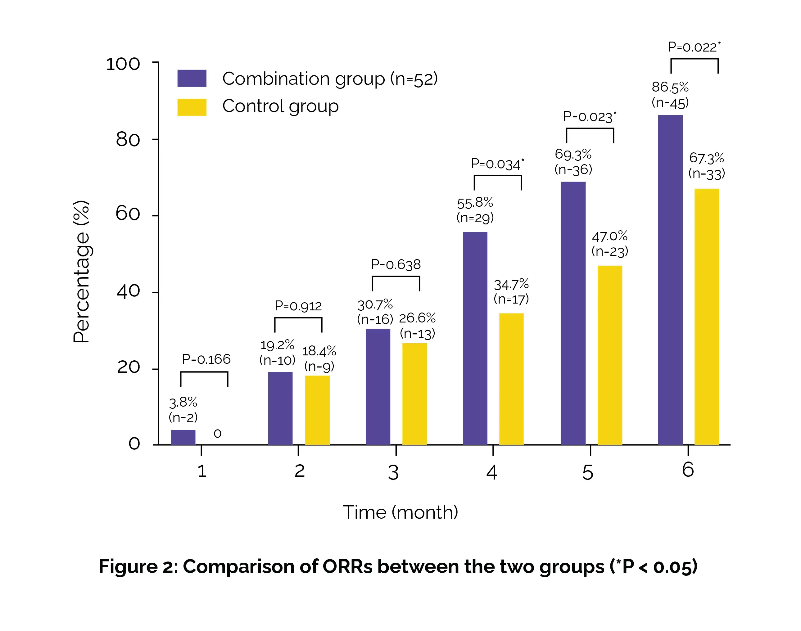 By the fourth month, the overall response rates (ORRs) were markedly higher in the combination group, reaching 86.5% by the sixth month compared to 67.3% in the control group (Figure 2).
