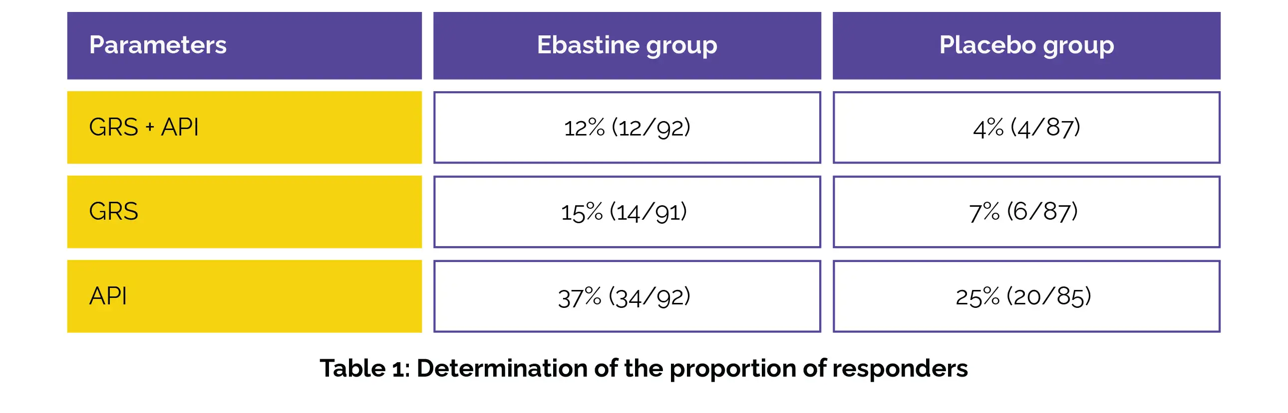 Those receiving Ebastine displayed a considerably higher proportion of responders for the composite endpoint of GRS + API compared to the placebo group. Additionally, while not statistically significant, Ebastine also demonstrated better proportions of responders for API and GRS separately, as shown in Table 1: