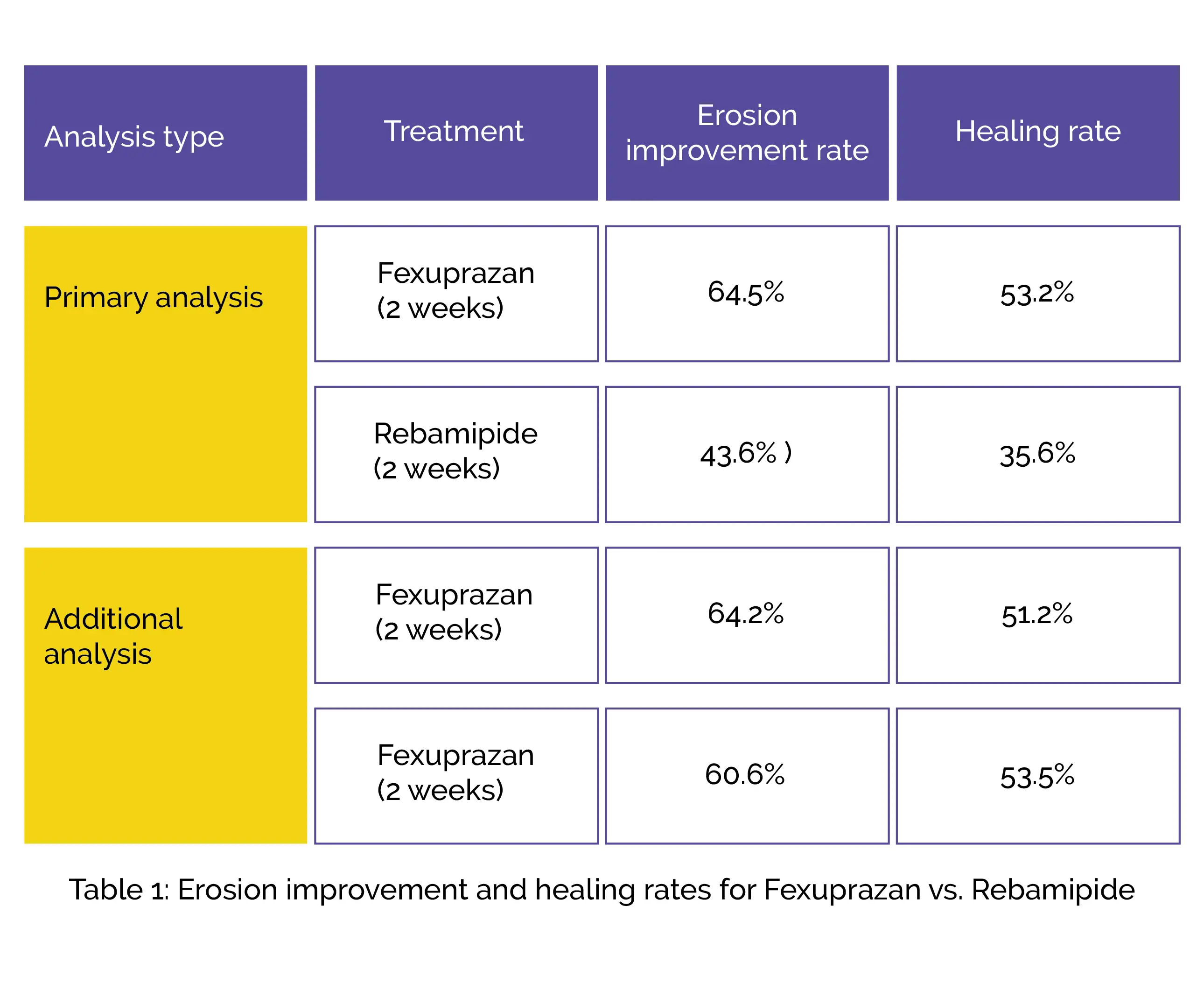 They assessed erosion improvement and healing rates after two weeks of Fexuprazan versus two or four weeks of Rebamipide, calculating risk differences and confidence intervals for treatment effects. In the primary analysis, Fexuprazan showed better erosion improvement and healing rates than Rebamipide. In the additional analysis, Fexuprazan's results were similar to four weeks of Rebamipide (Table 1).