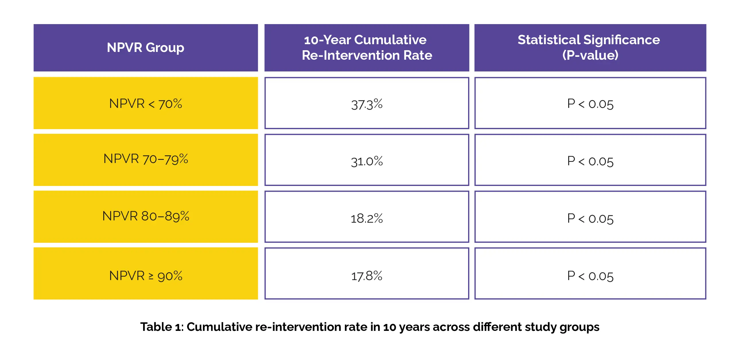 Cumulative re-intervention rates for USgHIFU-treated patients were observed as 3.4% at 1 year, 11.8% at 3 years, 16.8% at 5 years, 22.6% at 8 years, and 24.1% at 10 years. A notable difference was observed in the cumulative re-intervention rate at 10 years across the four NPVR groups, as mentioned in Table 1. Also, groups NPVR 80-89% and NPVR ≥90% (P = 0.499) showed no statistically significant difference.