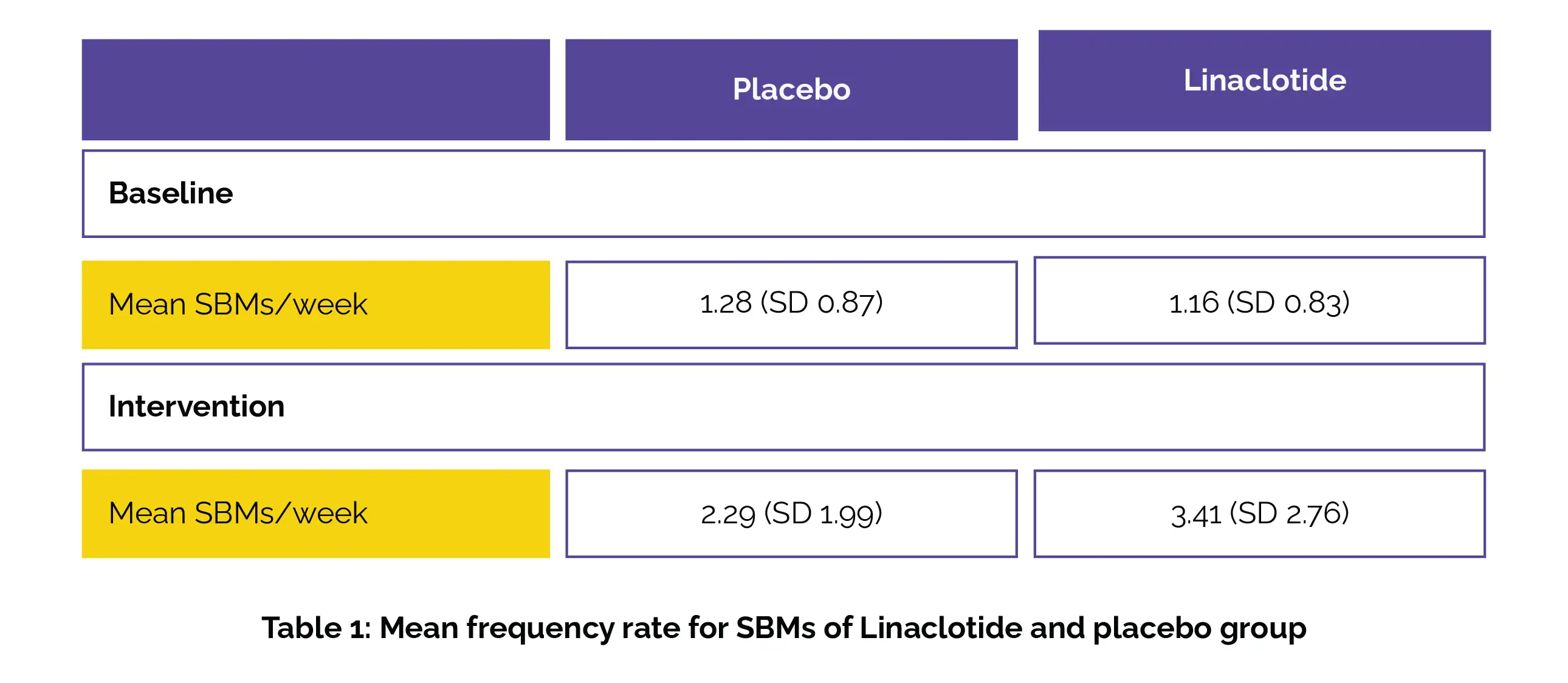 From Oct 1, 2019, to March 21, 2022, 330 children were registered and randomly divided into linaclotide (n=166) or placebo (n=164) groups. Safety and efficacy endpoints were evaluated in 328 patients (164 patients in each group) as 2 children in the linaclotide group received no therapy. Of the total, 293 children (89%) completed the specified treatment period (328 females [55%, 147 males [45%]). The mean frequency rate for SBMs at baseline and during the intervention is shown in the following Table 1: