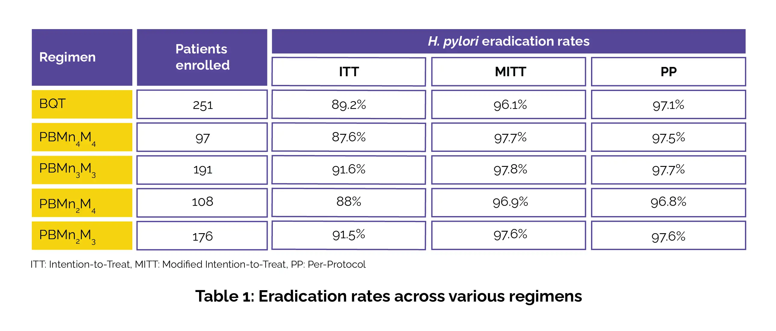 Eradication was assessed via 13C-urea breath test six weeks post-treatment, and all adverse effects were documented. Eradication rates were high across all regimens as shown in Table 1 below: