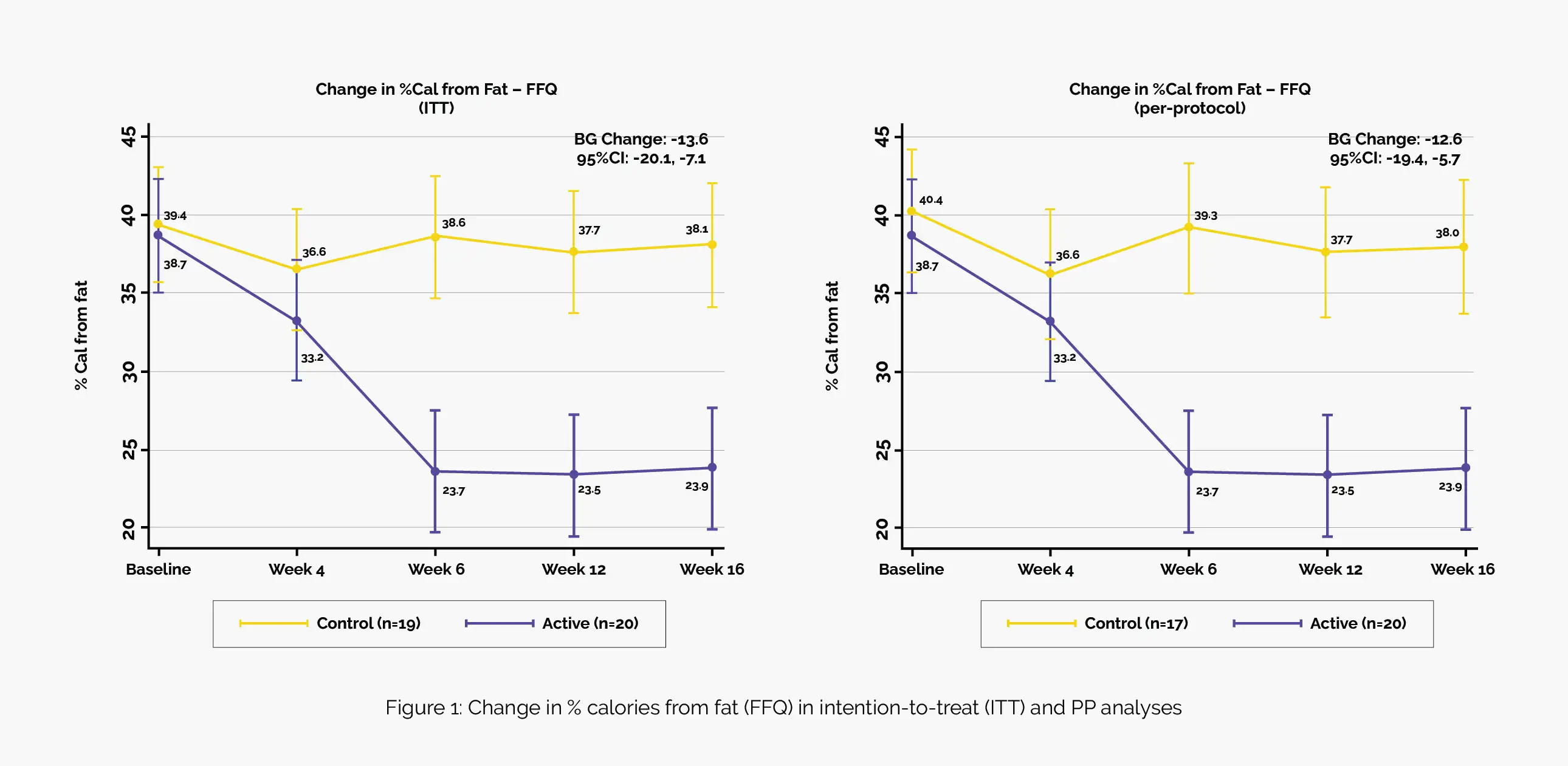 The active group demonstrated a substantial reduction in mean fat calorie intake from 39% at baseline to 24% at the study end, with notable proportions achieving <25% (45%) and <20% (25%) calories from fat. In contrast, the control group showed less adherence, with only 5.3% achieving <25% and 5.3% achieving <20% calories from fat. Overall, the active group displayed a 15% decrease in mean fat calorie intake, significantly more than the 1% decrease observed in the control group (between-group [BG] change = −14), indicating robust adherence to the study diet (Figure 1).