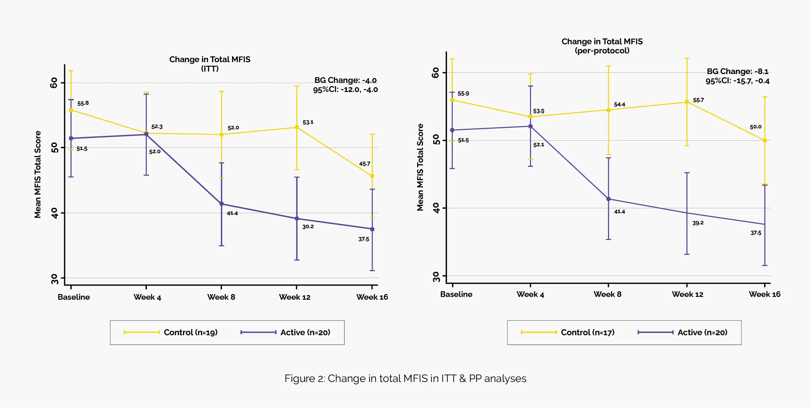 During the ITT analysis, the active group demonstrated a noteworthy mean reduction of 14 points in the total MFIS score, while the control group experienced a reduction of 10 points. The BG mean decrease was 4 points. The PP analysis supported these findings, revealing a BG mean decrease of 8 points, and sensitivity analysis added robustness to this BG decrease by showing a further reduction of 14 points (Figure 2).