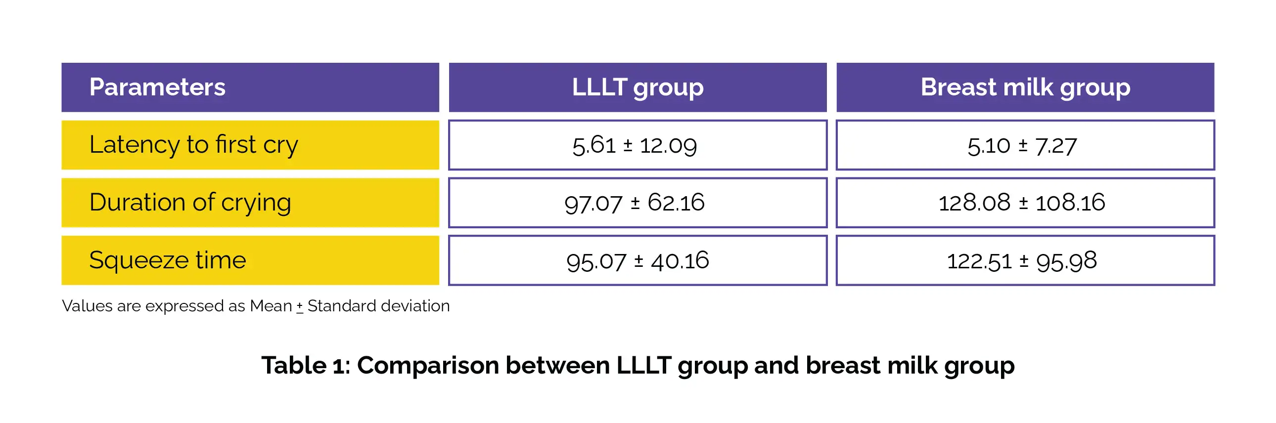 Behavioral responses were the primary outcomes measured, while secondary outcomes encompassed physiological responses and levels of salivary cortisol and α-amylase. While there were no profound differences in latency to first cry or cry duration between the two groups, the study revealed that the squeeze time was substantially shorter in the LLLT group when compared to the breast milk group, as shown in Table 1: