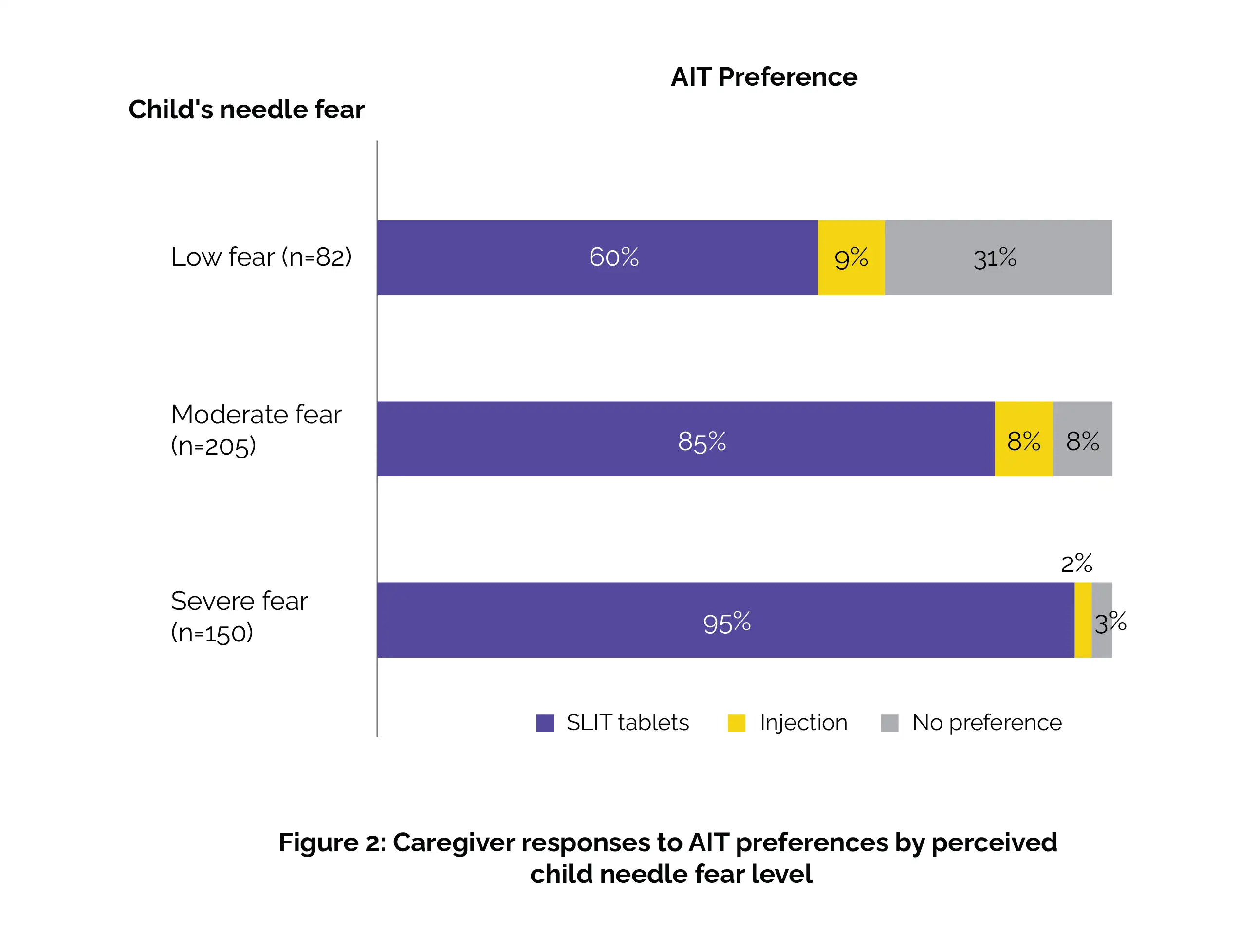 Caregiver responses to allergy immunotherapy (AIT) preferences based on their perception of their child's needle fear level are illustrated in Figure 2: