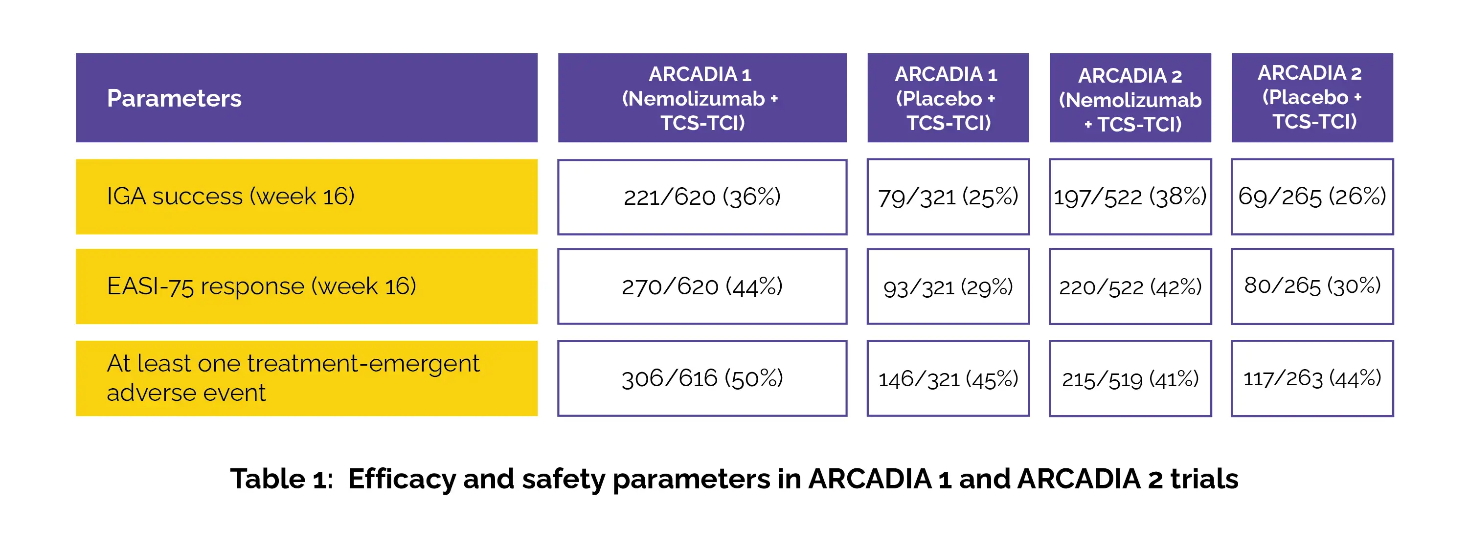 In adults and adolescents suffering from atopic dermatitis, a recent study demonstrated that subcutaneous Nemolizumab, combined with topical corticosteroids (TCS) and topical calcineurin inhibitors (TCI), led to remarkable improvements in both inflammation and itch. Two international Phase 3 trials, ARCADIA 1 and ARCADIA 2, determined Nemolizumab's efficacy and safety in addressing atopic dermatitis. The aim of this report was to summarize the findings from the 16-week initial treatment phase of these studies.