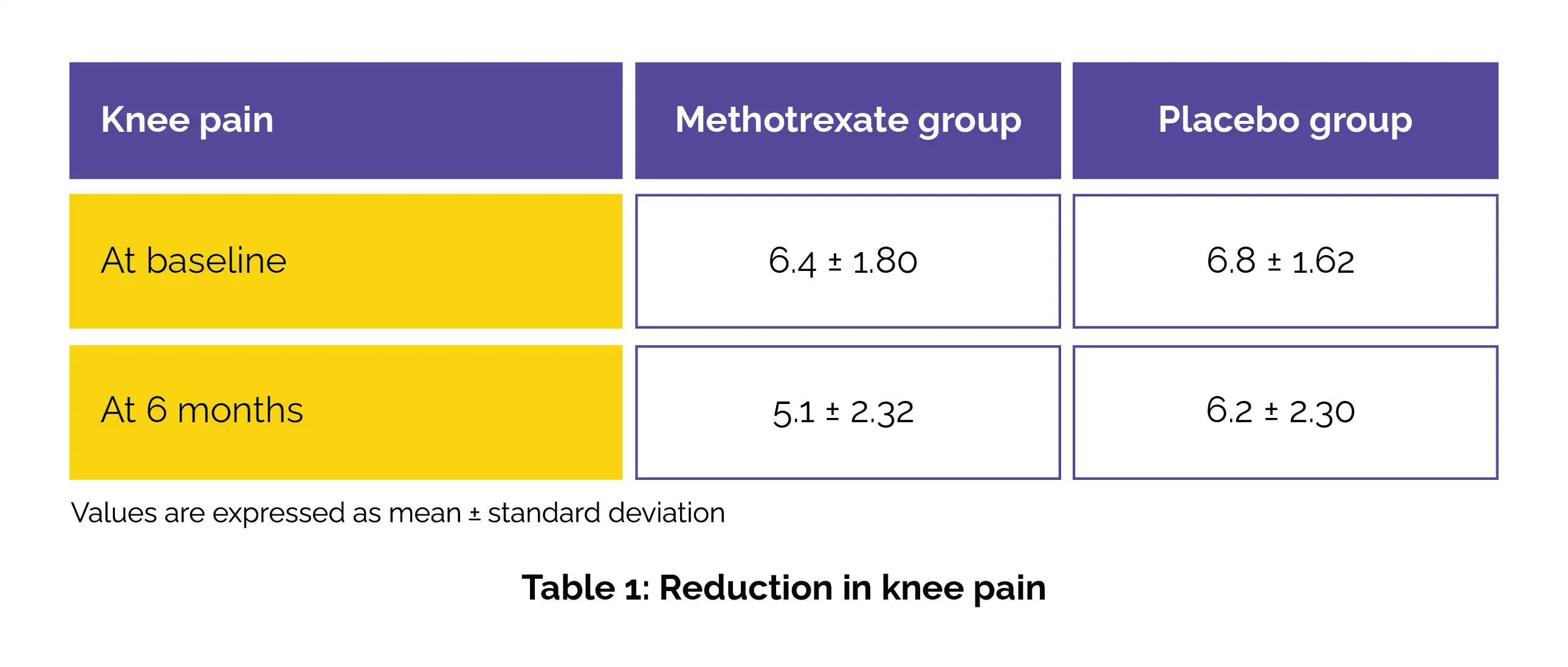 Patients suffering from symptomatic, radiographic knee OA and frequent knee pain (severity ≥4/10) over the past 3 months, unresponsive to current medications, were enrolled. The recruited subjects were randomly assigned in a 1:1 ratio to get either oral Methotrexate (10–25 mg weekly, with a 6-week escalation) or a matched placebo over 12 months, while continuing their usual analgesic treatment. Average knee pain was the key outcome ascertained.