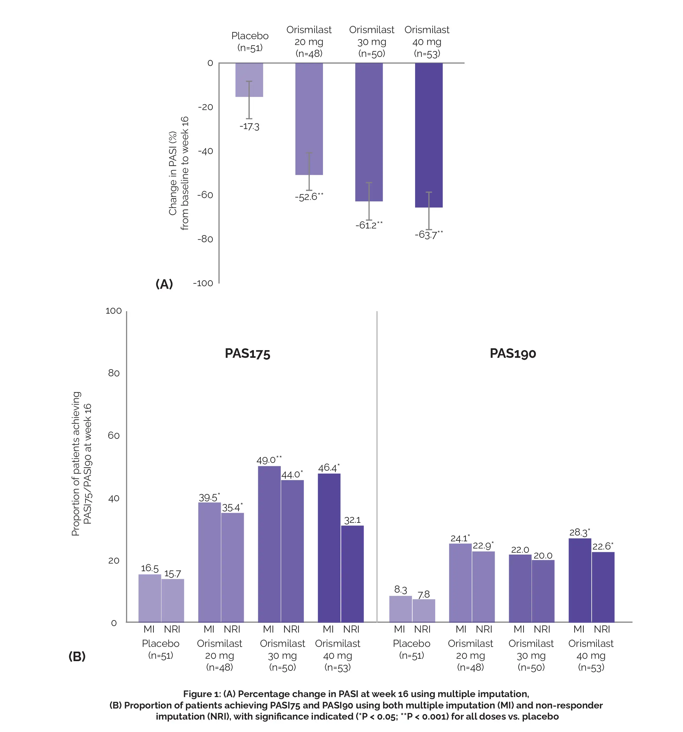 The key secondary effectiveness outcomes included achieving a 75% decline in PASI (PASI75), attaining a skin clarity score of clear (0) or almost clear (1), and achieving a >2-point betterment in Investigator's Global Assessment (IGA 0/1) at week 16. Out of the 202 patients randomized, baseline characteristics were comparable between the groups, except for a higher proportion of severe disease in the Orismilast group compared to the placebo group.