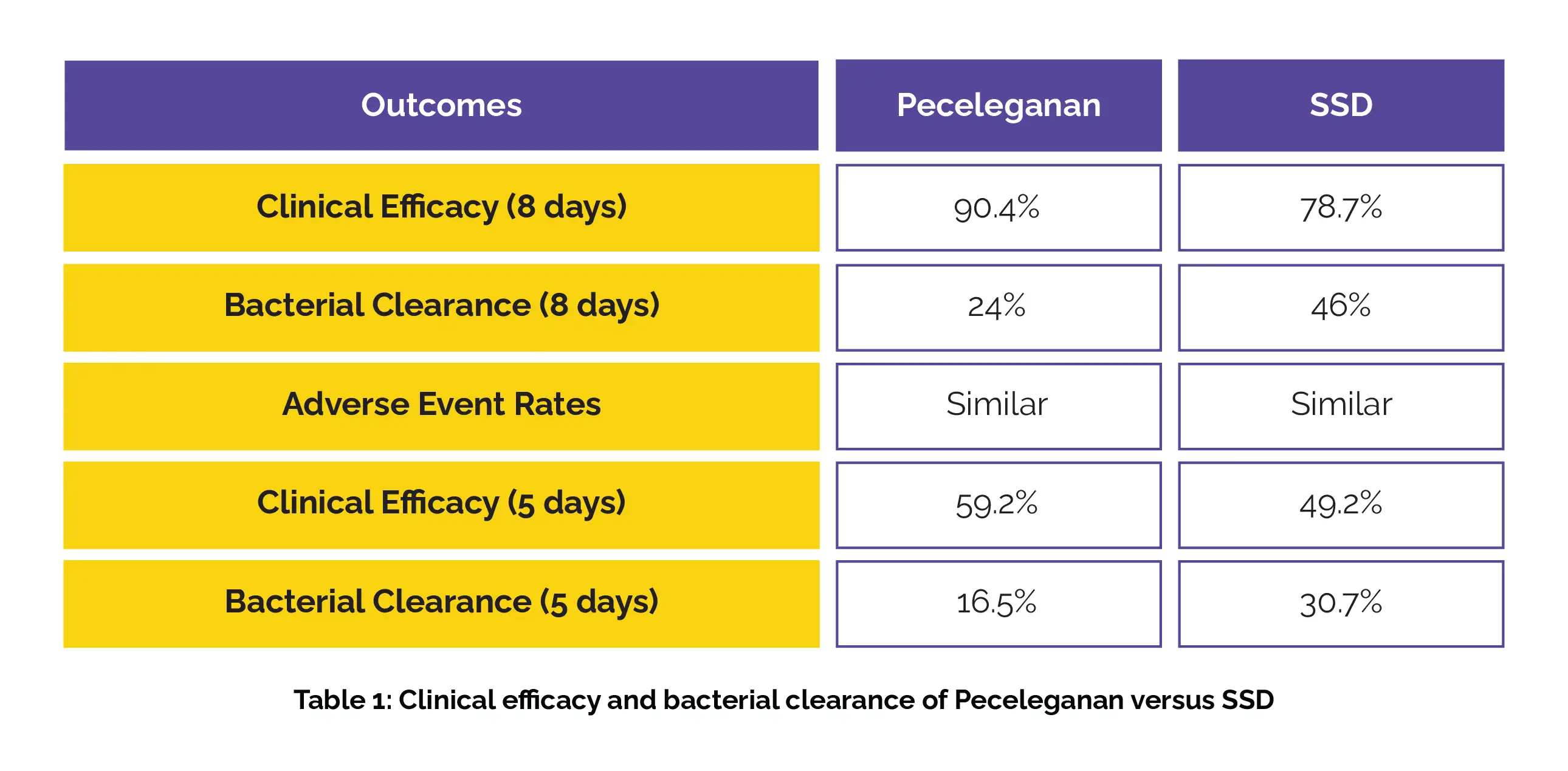 Overall, 558 patients completed the trial. After 8 days of therapy, Peceleganan demonstrated higher clinical efficacy than SSD, but with lower bacterial clearance. Adverse event rates were similar for both treatments. After 5 days, Peceleganan also showed better clinical efficacy compared to SSD, although bacterial clearance was lower.