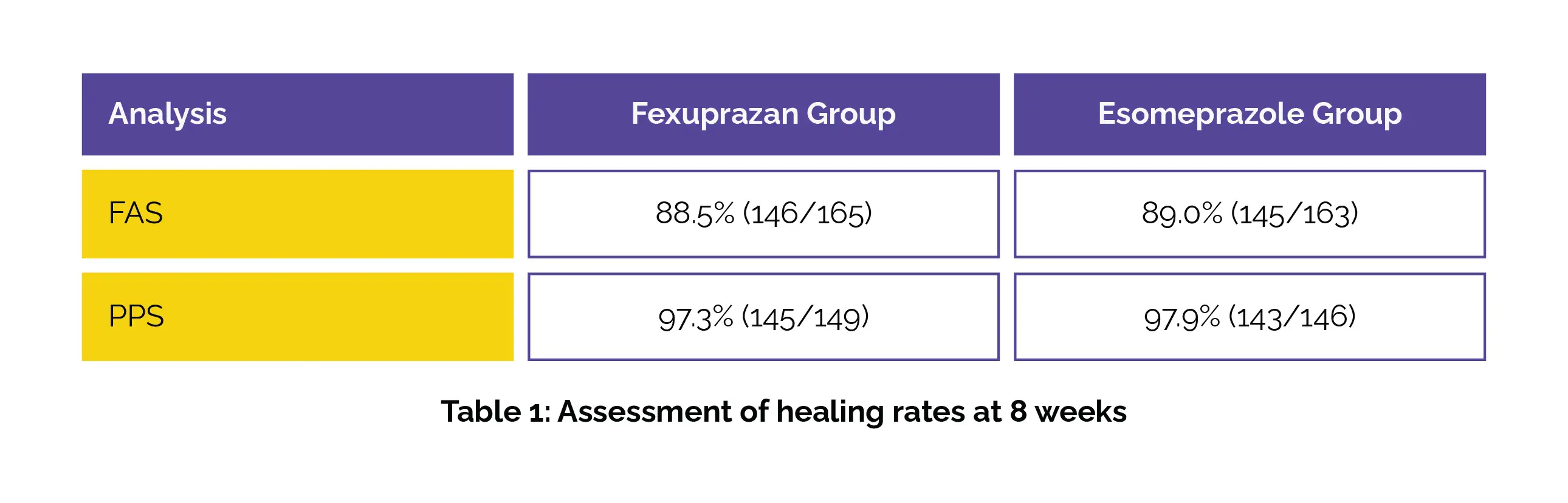 Both medications achieved high rates of erosive esophagitis healing. Fexuprazan demonstrated noninferiority to Esomeprazole in terms of erosive esophagitis healing rates at 8 weeks in both the FAS and PPS analyses, as depicted in Table 1: