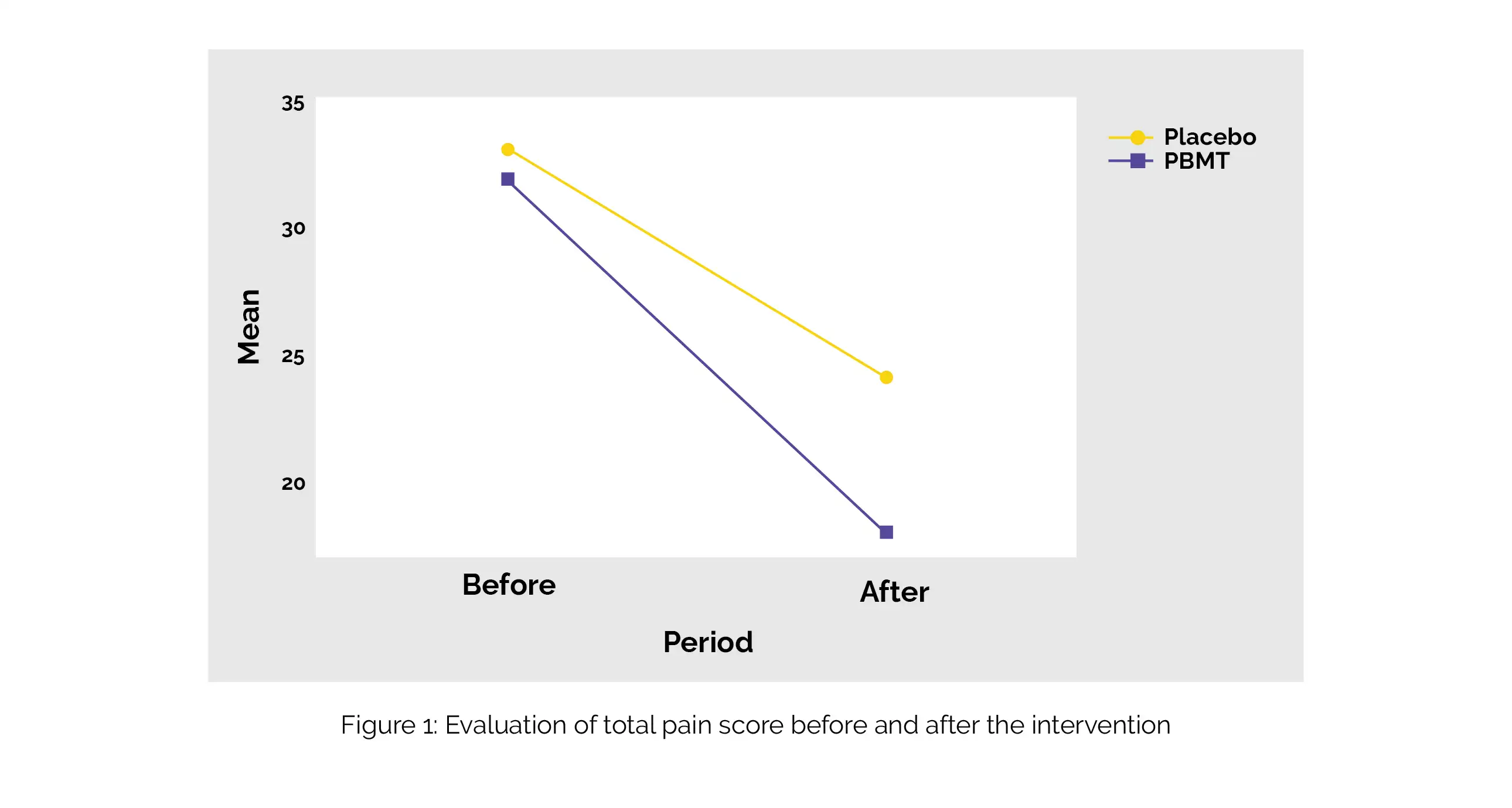The PBMT protocol group exhibited a decrease in the overall pain score (Figure 1), a decline in the count of painful points, and an improvement in MMO in comparison with the placebo protocol (sham-PBMT).