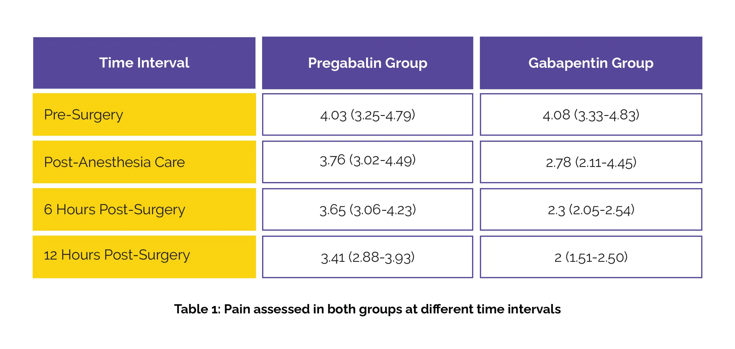 Both medications led to reductions in pain scores over time. However, the rate of reduction in the Pregabalin group considerably surpassed that of the Gabapentin group. Specifically, mean pain scores with 95% confidence intervals (CI) at 4 intervals were noted (Table 1):