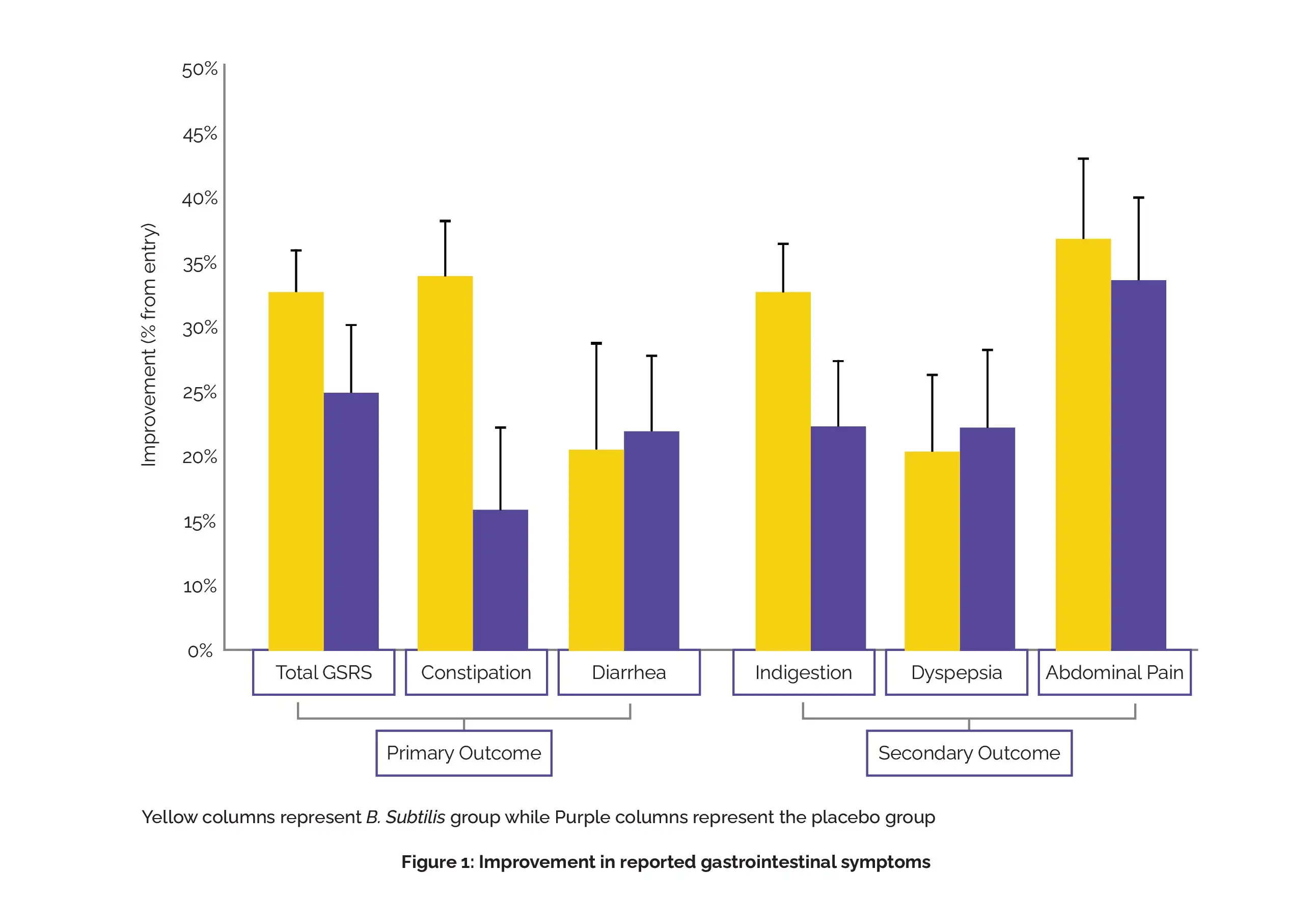 Both other major endpoints, diarrhea and total GSRS, exhibited substantial betterment in both the placebo and experimental groups (22%/20% and 26%/32%, respectively). The pre-planned secondary endpoint, indigestion, showed improvement at 4 weeks (32%), but the difference in comparison with the placebo (21%) did not reach significance.