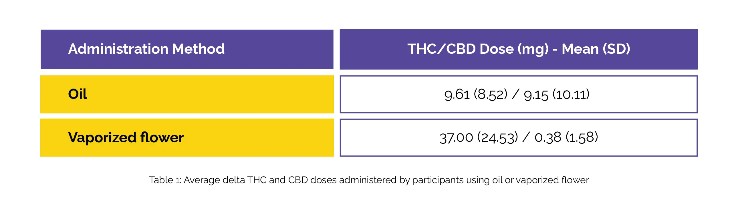 A total of 40 people (mean age of 41.38 years, 22 females) participated in this study. They were suggested to use different products, such as orally administered oils (23 participants) and vaporized flower (17 participants) for a mean of 10.18 (8.73) months. The most prevalent indication for medical cannabis use was chronic non-cancer pain (20 participants), followed by sleeping illness (18 participants) and anxiety (11 participants). The mean (SD) delta-9-tetrahydrocannabinol (THC)/cannabidiol (CBD) dose administered by participants using an oil, and vaporized flower, are as follows (Table 1):