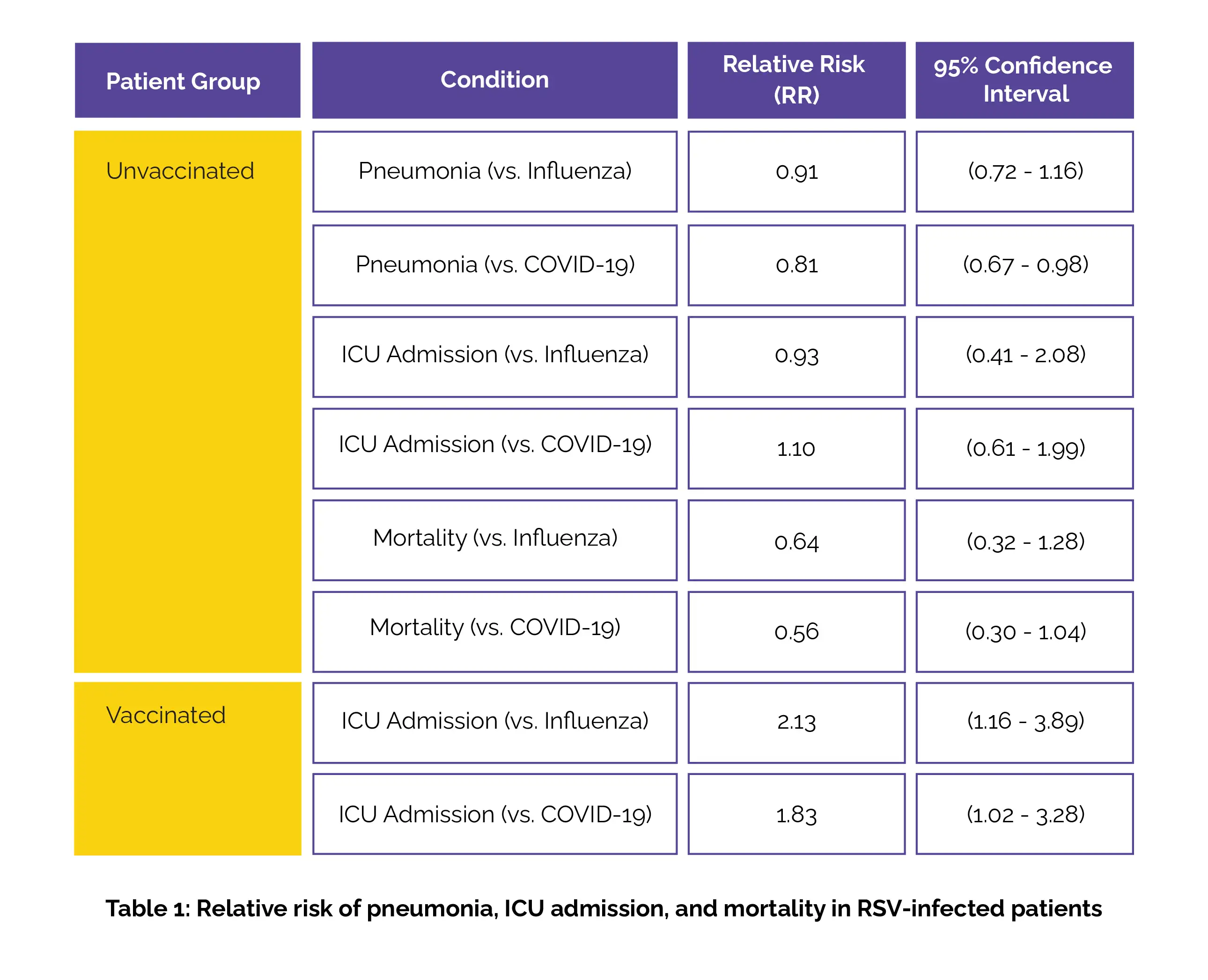 Among the unvaccinated patients, those with RSV faced a similar or lower risk of pneumonia compared to influenza and SARS-CoV-2. ICU admissions were also comparable, and mortality risks were lower with RSV. In contrast, vaccinated patients exhibited similar patterns, but those with RSV showed a markedly increased risk of ICU admission compared to influenza and SARS-CoV-2, refer to Table 1: