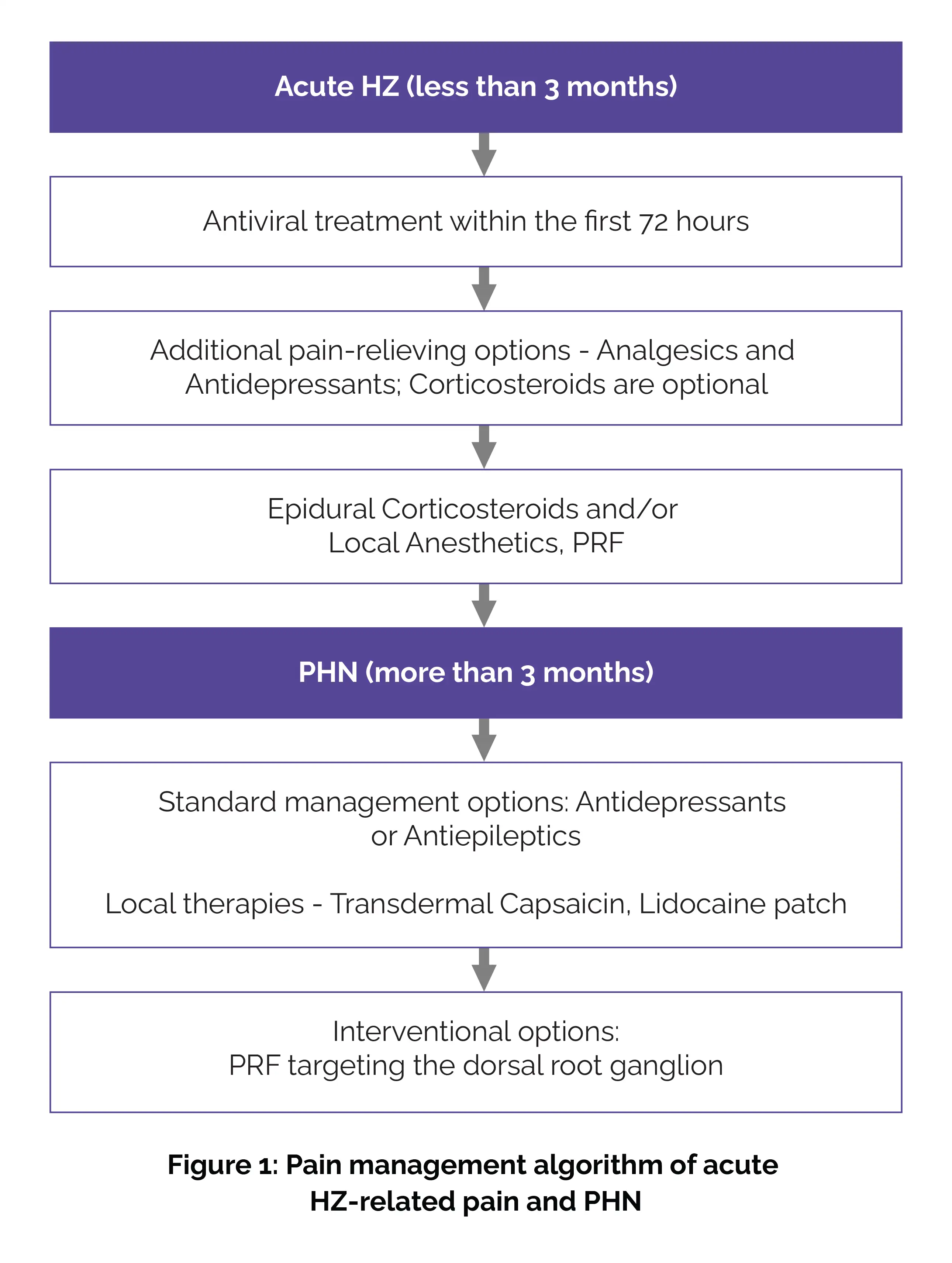 However, when pain persists, interventional options become necessary. Epidural injections with local anesthetics and corticosteroids are one approach, but PRF targeting the dorsal root ganglion has emerged as the most promising method for reducing pain in PHN patients. For PHN specifically, transdermal capsaicin, lidocaine, and oral medications (e.g., antidepressants or antiepileptics) are often recommended treatment options (Figure 1):
