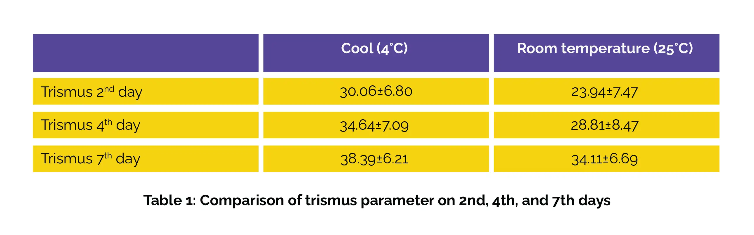 According to a randomized split-mouth clinical study published in the “Nigerian Journal of Clinical Practice”, the use of cold saline irrigation therapy (4°C) was found to be more effective than when used at room temperature (25°C) on the trismus (commonly called as lockjaw) after the surgery of mandibular third molars.