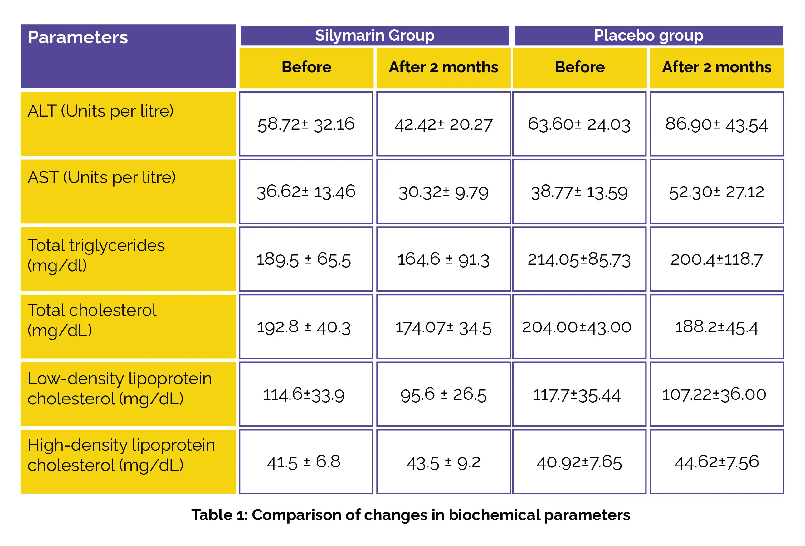 In conclusion, the notable reduction in liver enzymes and lipid markers observed in NAFLD patients receiving 150 mg of Silymarin twice daily suggested the potential of this compound as a novel therapeutic approach for NAFLD.