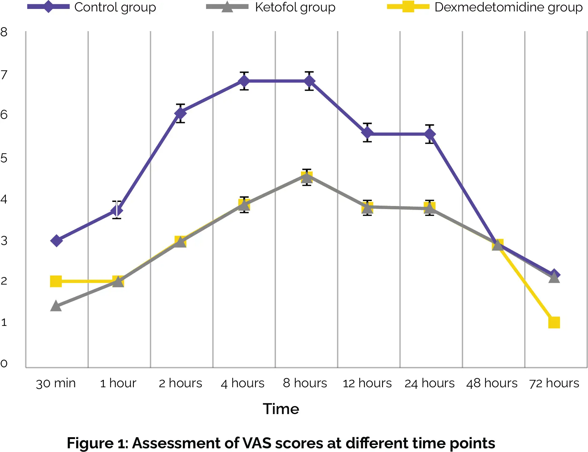 The main focus was on determining the occurrence of postoperative delirium. The secondary focus was on the frequency of emergence agitation, post-surgical pain, use of rescue opioids, hemodynamic changes, and adverse effects (side effects), if any. At all specified time points, the occurrence of postoperative delirium was statistically considerably lower in Group D and Group K compared to Group C. Also, the visual analogue scale (VAS) scores remarkably decreased in these groups than the control group at all-time points, apart from at 48 hours and 72 hours after the surgery, where the values of the 3 groups were similar, as shown in Figure 1: