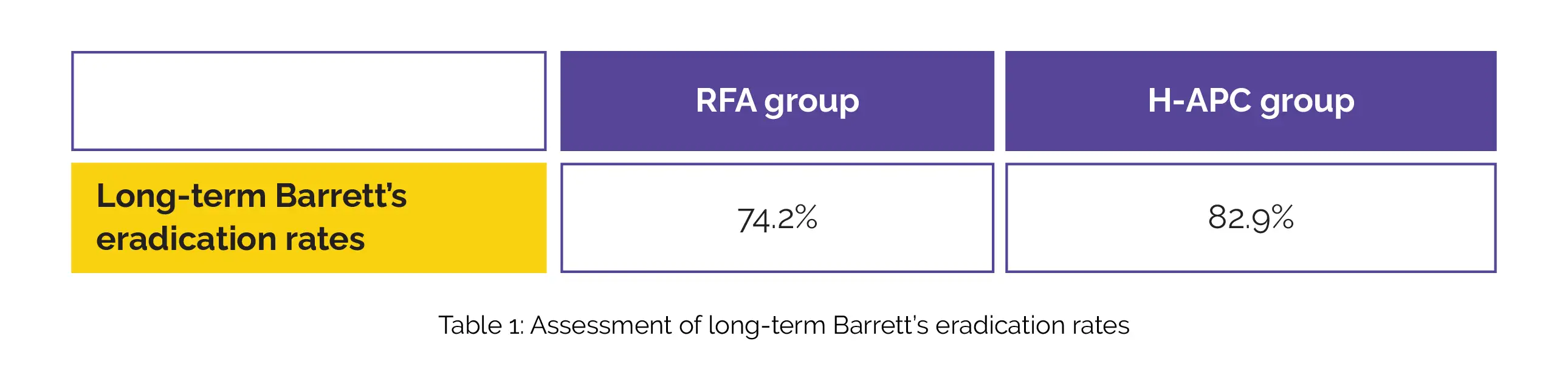 In patients with Barrett’s esophagus, both RFA and H-APC yield positive outcomes concerning the eradication rate, with a slightly superior result observed with H-APC use. However, RFA use is linked with significantly higher levels of pain, both in terms of severity and duration.