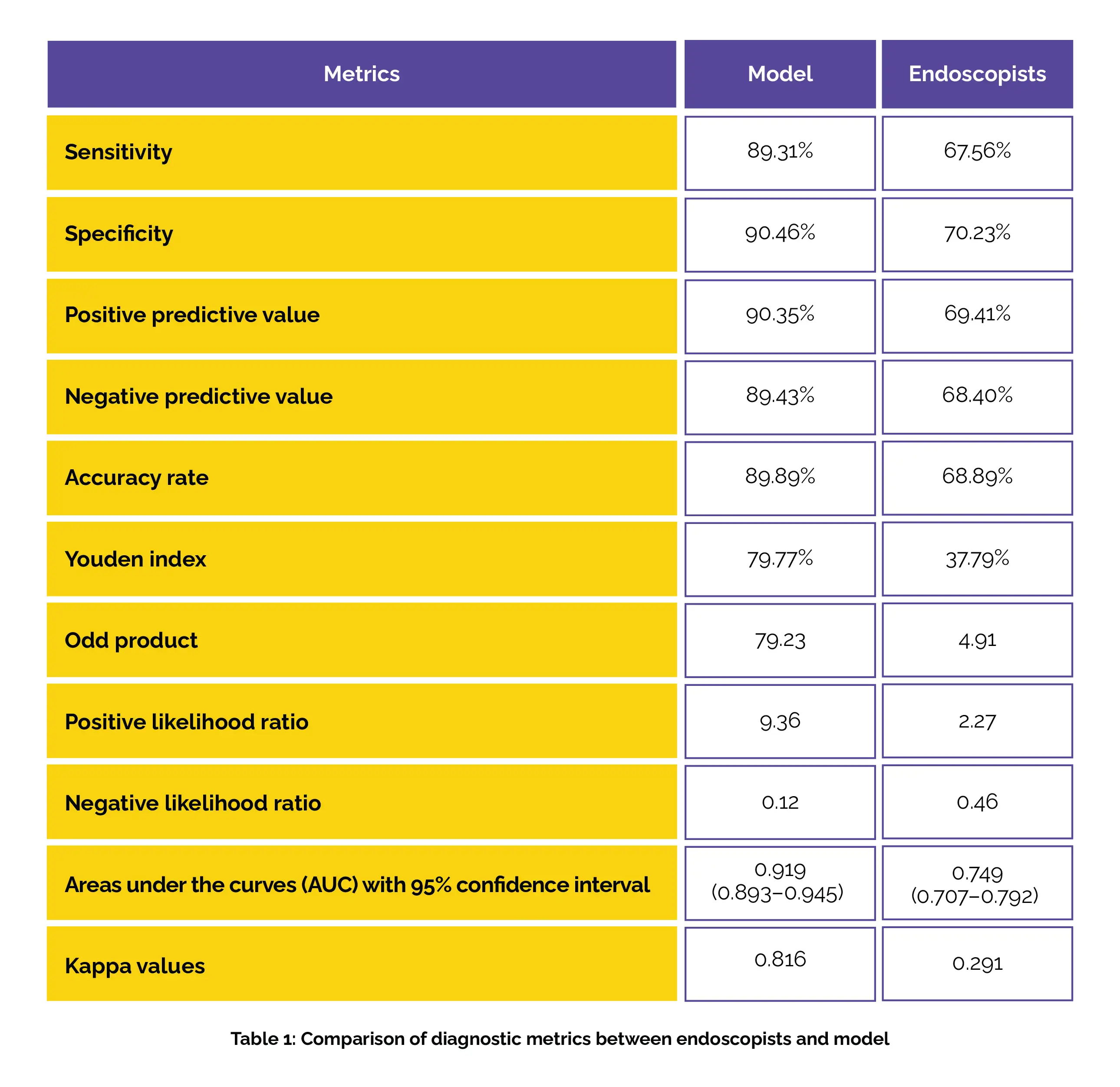 The study included a total of 1306 participants, divided into two groups: the CAG group and the group with chronic non-atrophic gastritis-affected patients, based on pathological findings. Diagnostic evaluation indices were then assessed for each group. The model automatically labeled each atrophy lesion and evaluated its severity. To address potential selection bias, the researchers utilized propensity score matching. The model exhibited superior diagnostic evaluation indices and better consistency with OLGA staging compared to endoscopists, as depicted in Table 1: