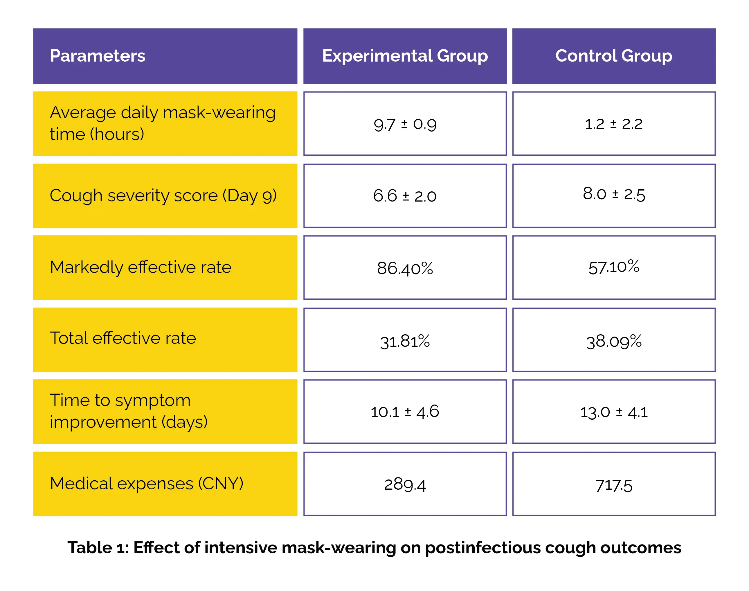 However, the experimental group, which adhered to prolonged mask use, experienced remarkably greater reductions in cough severity by the 9th day, higher treatment effectiveness rates, and a shorter time to symptom improvement. Additionally, medical costs were notably lower in the experimental group, indicating that intensive mask-wearing could help reduce financial burdens associated with postinfectious cough treatment. The detailed comparison is provided in Table 1 below: