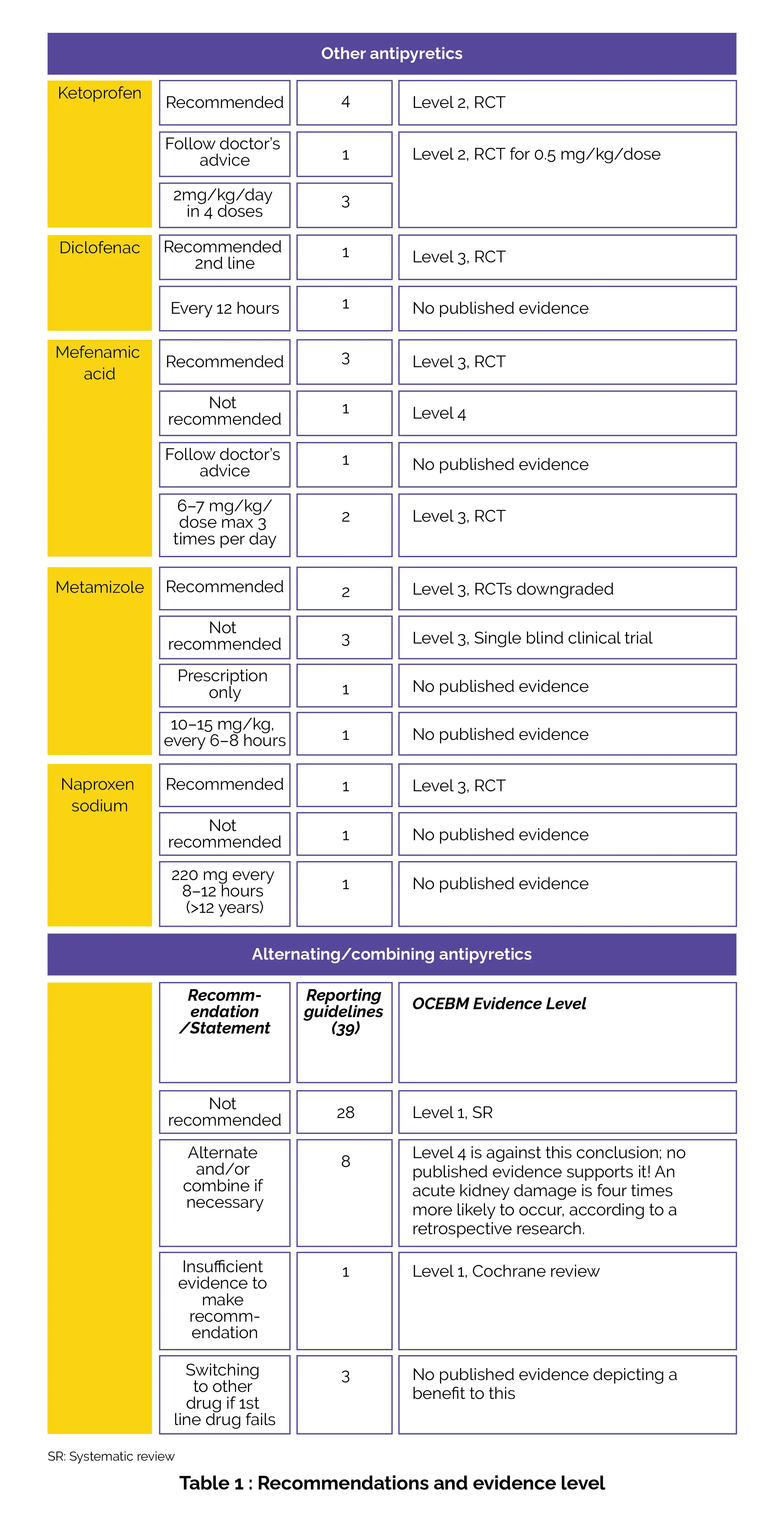 Since CPGs present low evidence levels for recommendations and a very low threshold for antipyresis, they need to be improved in terms of methodology, applicability and editorial independence. Thus, it becomes imperative to summarize and evaluate the existing information to produce a consensual and evidence-based fever guideline.