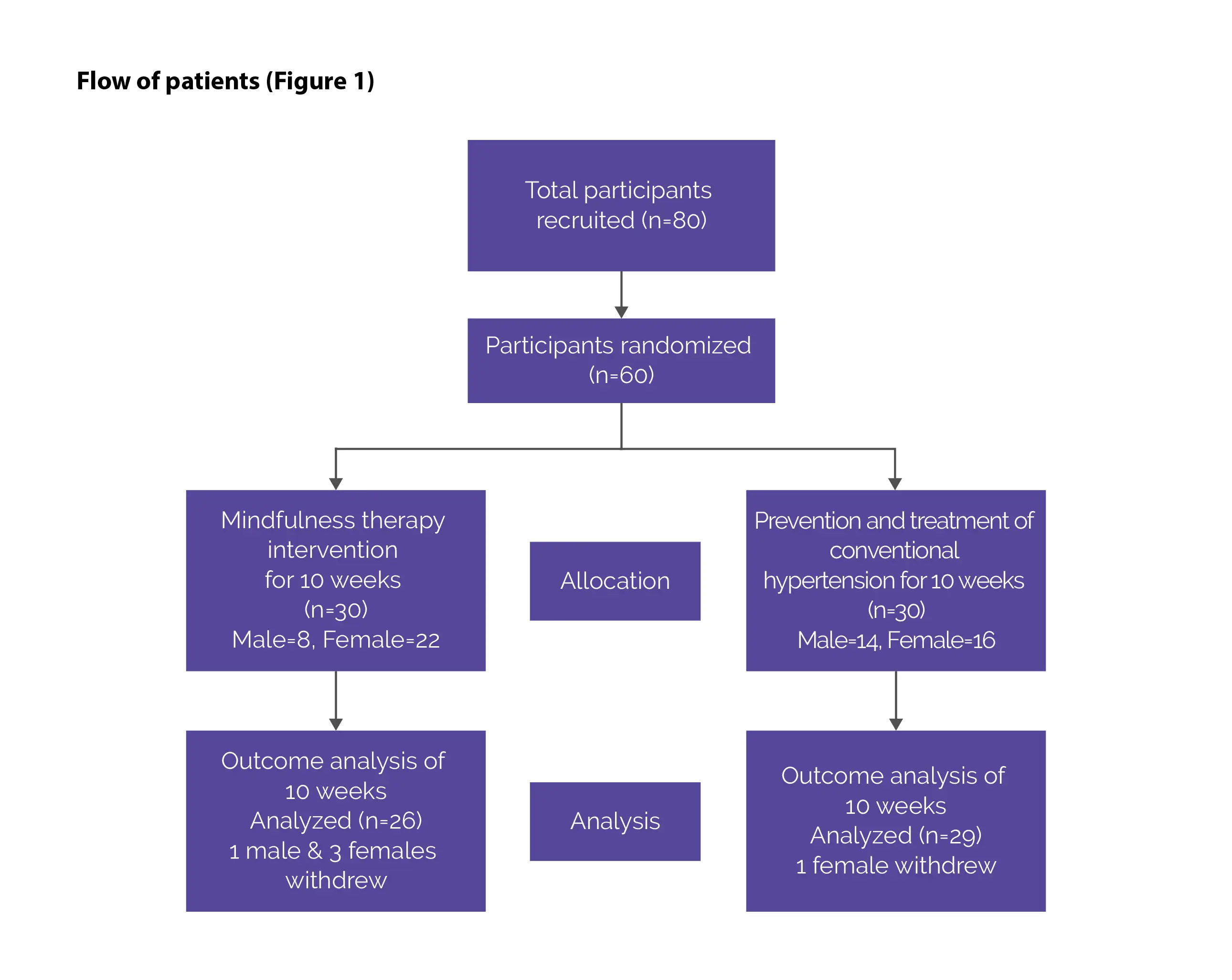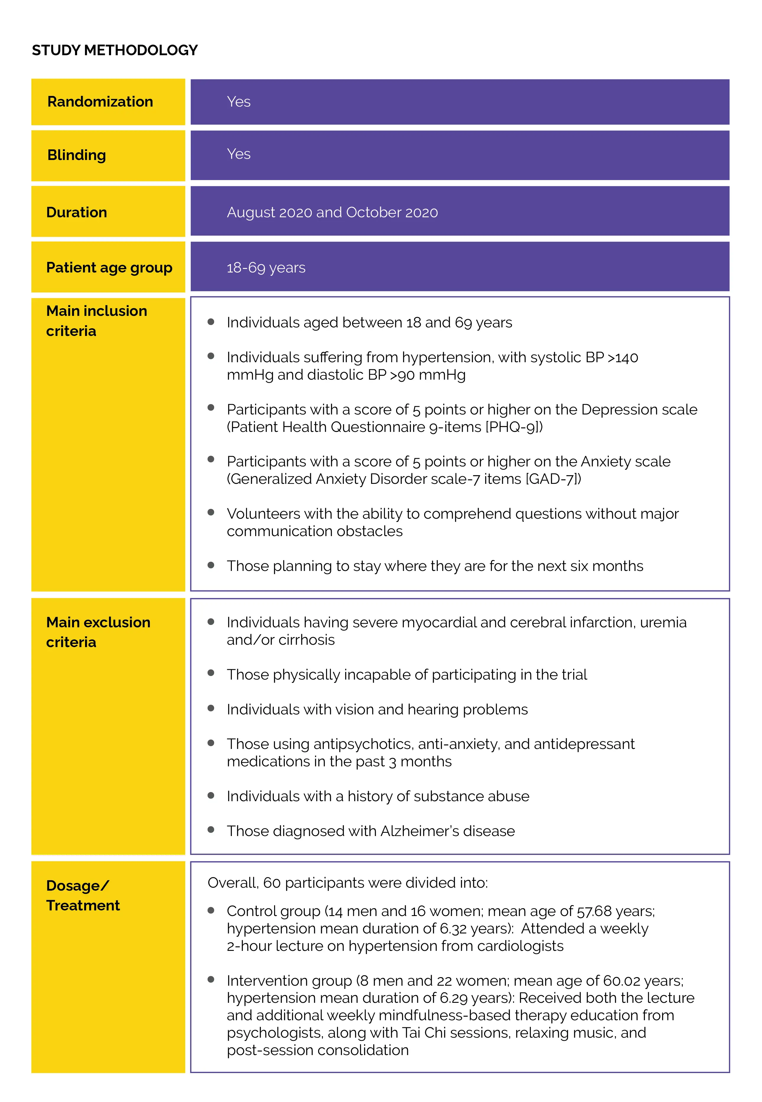 A prospective, double-blind, randomized controlled trial was performed to examine the efficacy of mindfulness-oriented intervention in reducing psychological stress and hypertension among hypertensive patients diagnosed with depression and/or anxiety.