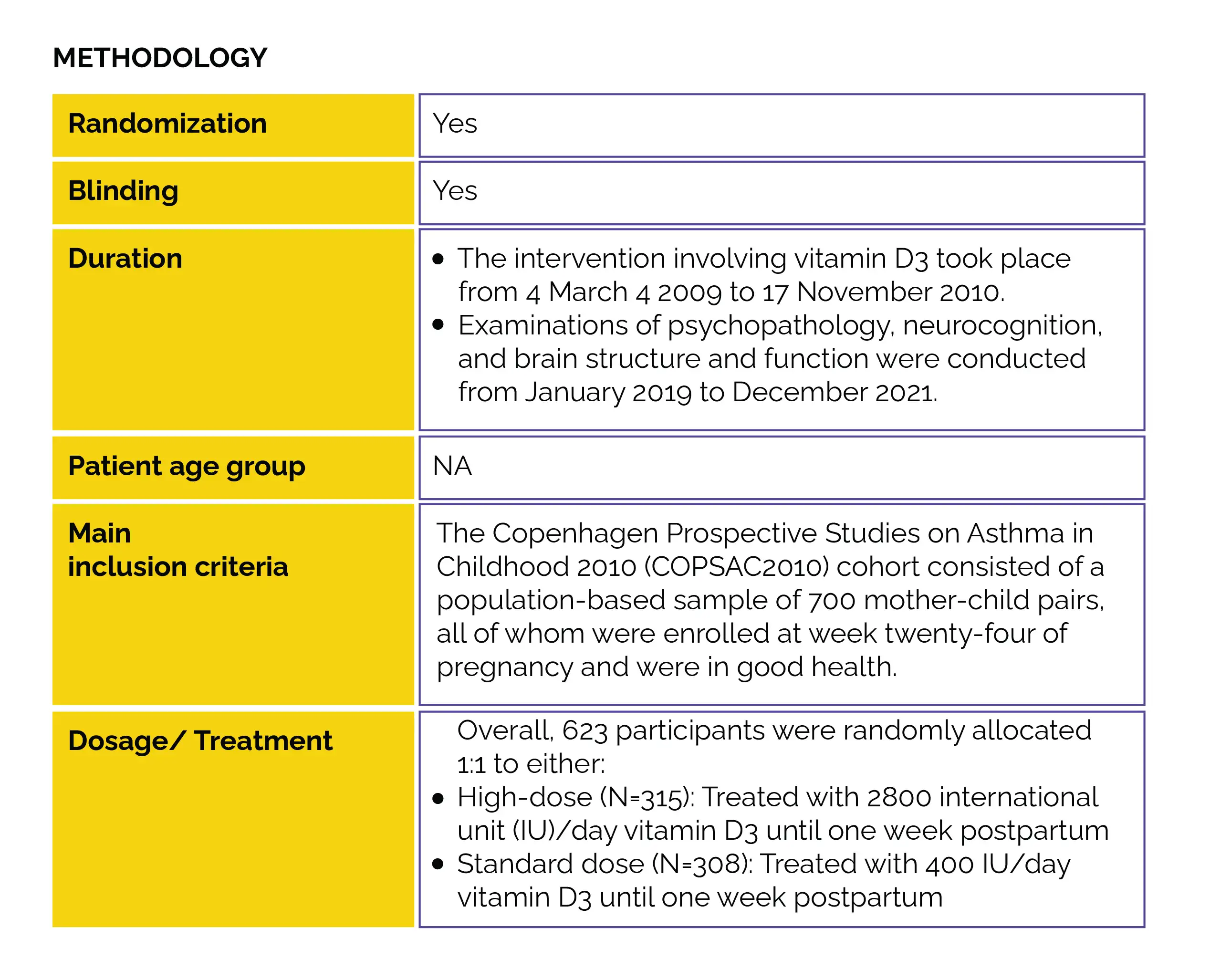 In a smaller case-control study, elevated gestational 25(OH)D was associated with fewer autistic symptoms estimated by medical care personnel using the Childhood Autism Rating Scale. However, a large birth cohort study reported no connection between gestational 25(OH)D levels and later parent-reported symptoms of ADHD. The overall defense against child autism and ADHD diagnosis or symptom load was not demonstrated by the high-dose vitamin D3 supplementation during pregnancy. The impact of vitamin D usage on the risk of autism or ADHD during pregnancy has not been explored in any previous RCT.