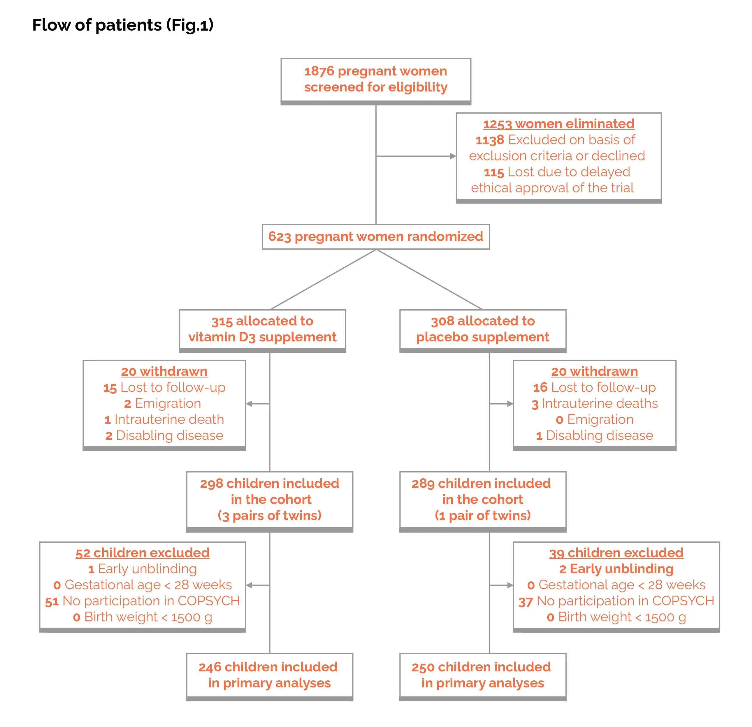 This RCT was conducted to determine the impact of high-dose versus standard-dose vitamin D3 use during pregnancy's third trimester. The study aimed to assess autism and ADHD risk, along with the clinically evaluated symptom load at the age of 10, as part of the COpenhagen Prospective Study on Neuro-PSYCHiatric Development (COPSYCH) project.