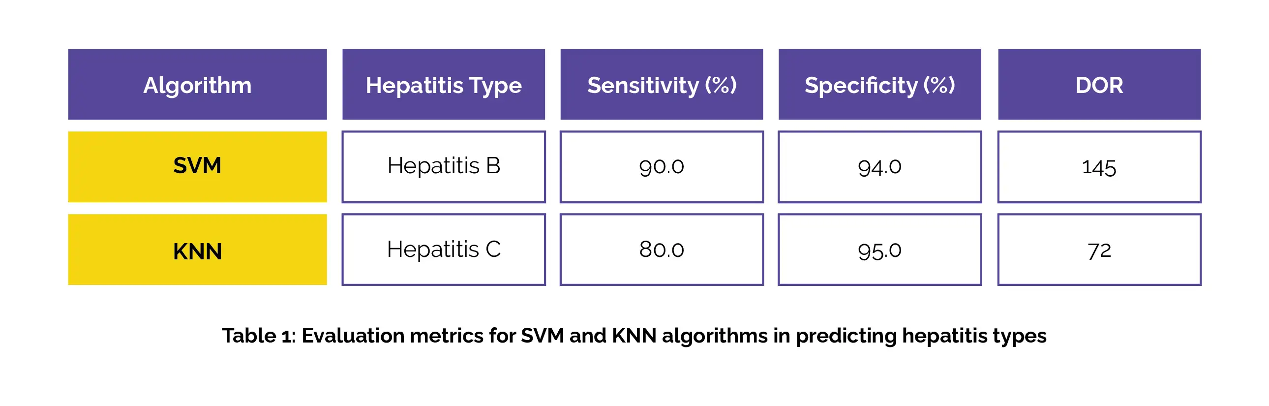 To sum up, the machine learning algorithms SVM and KNN demonstrated impressive performance in predicting hepatitis. SVM excelled in forecasting hepatitis B, while KNN proved to be more efficient in predicting hepatitis C. This suggested a considerable potential for these algorithms to enhance timely and accurate diagnosis in clinical practice, thereby improving hepatitis prediction and management.