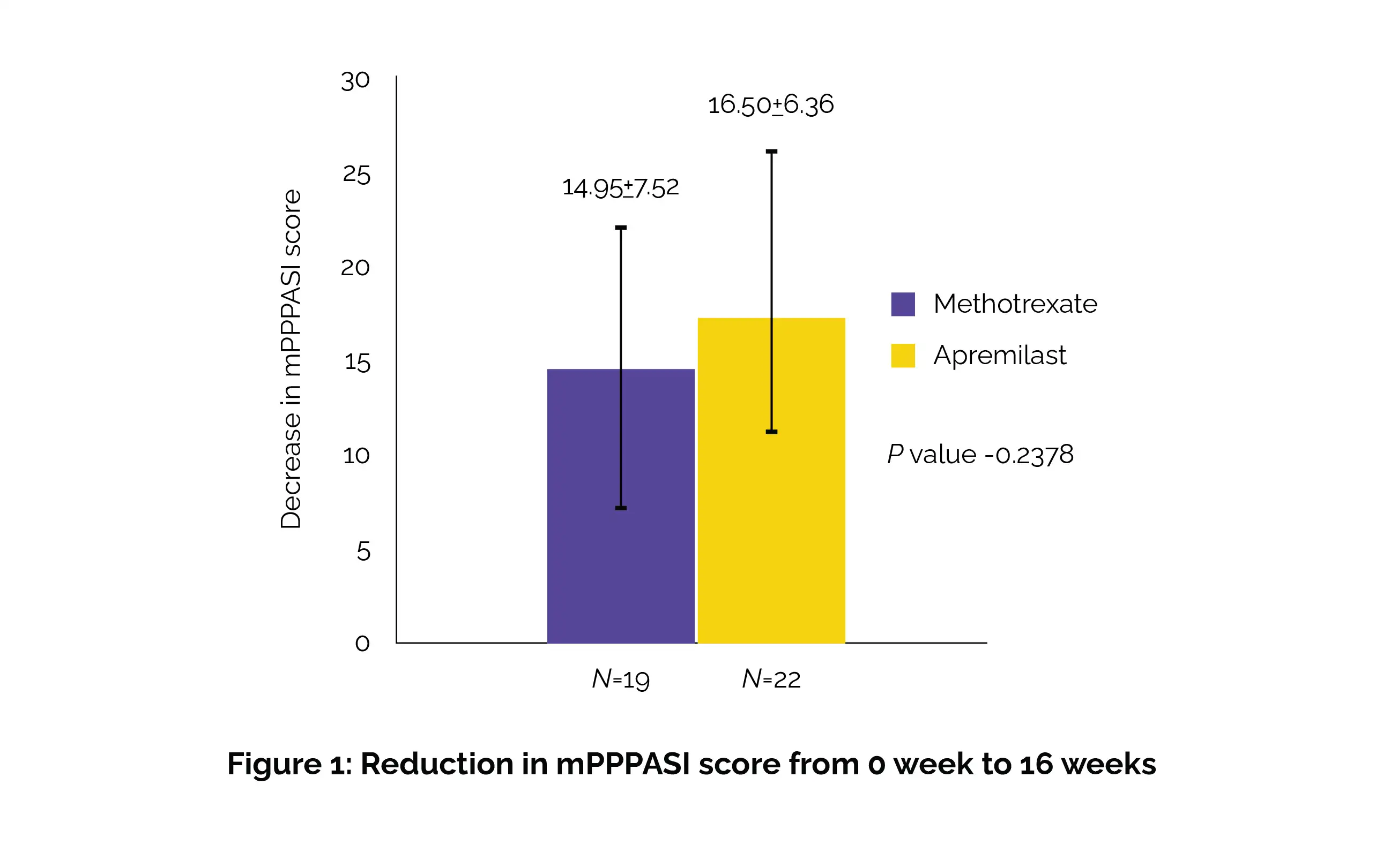 In this parallel-group, prospective, open-label study, participants (aged between 18 and 65 years) battling palmoplantar psoriasis were randomly allocated into two groups: Methotrexate (n = 19) or Apremilast (n = 22) for a duration of sixteen weeks. From week 0 to week sixteen, the decrease in the modified Palmoplantar Psoriasis Area and Severity Index (mPPPASI) score was the key effectiveness outcome.