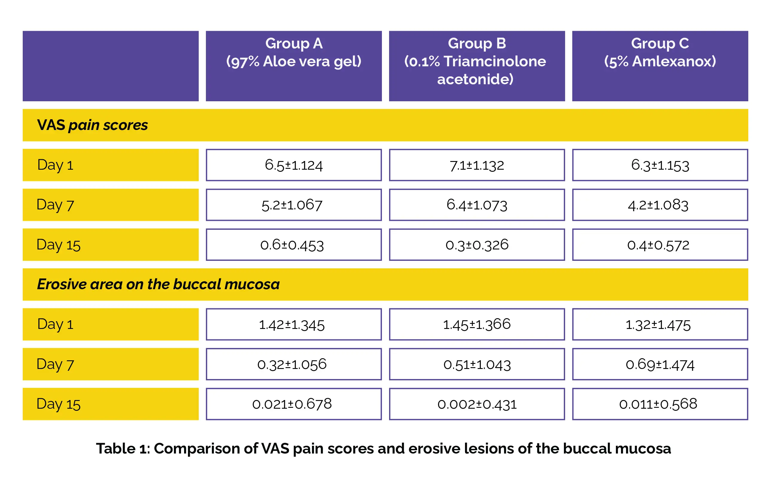 A profound drop in VAS pain scores, reduction in erosive area on the buccal mucosa, and improvement in ulcer healing were witnessed from day 1 to day 15 with all three tested drugs (Table 1 and Figure 1).