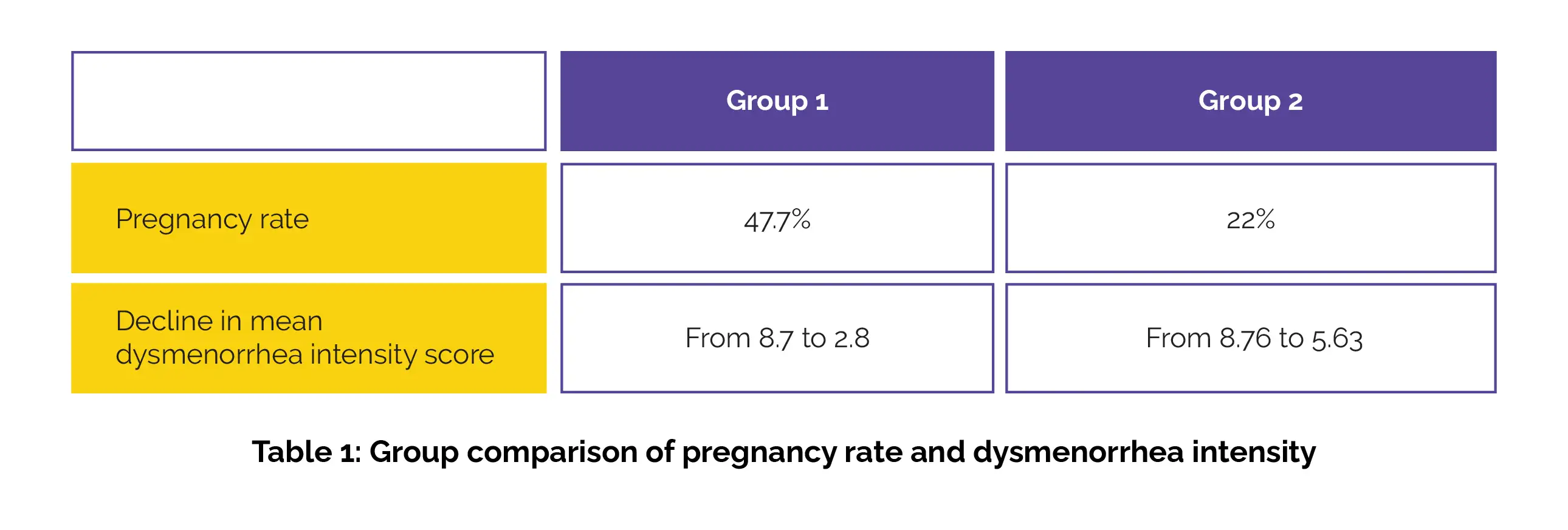 The pregnancy rate in Group 1 was markedly greater than in Group 2 Additionally, women in Group 1 reported a better reduction in dysmenorrhea intensity when compared to Group 2, as shown in Table 1: