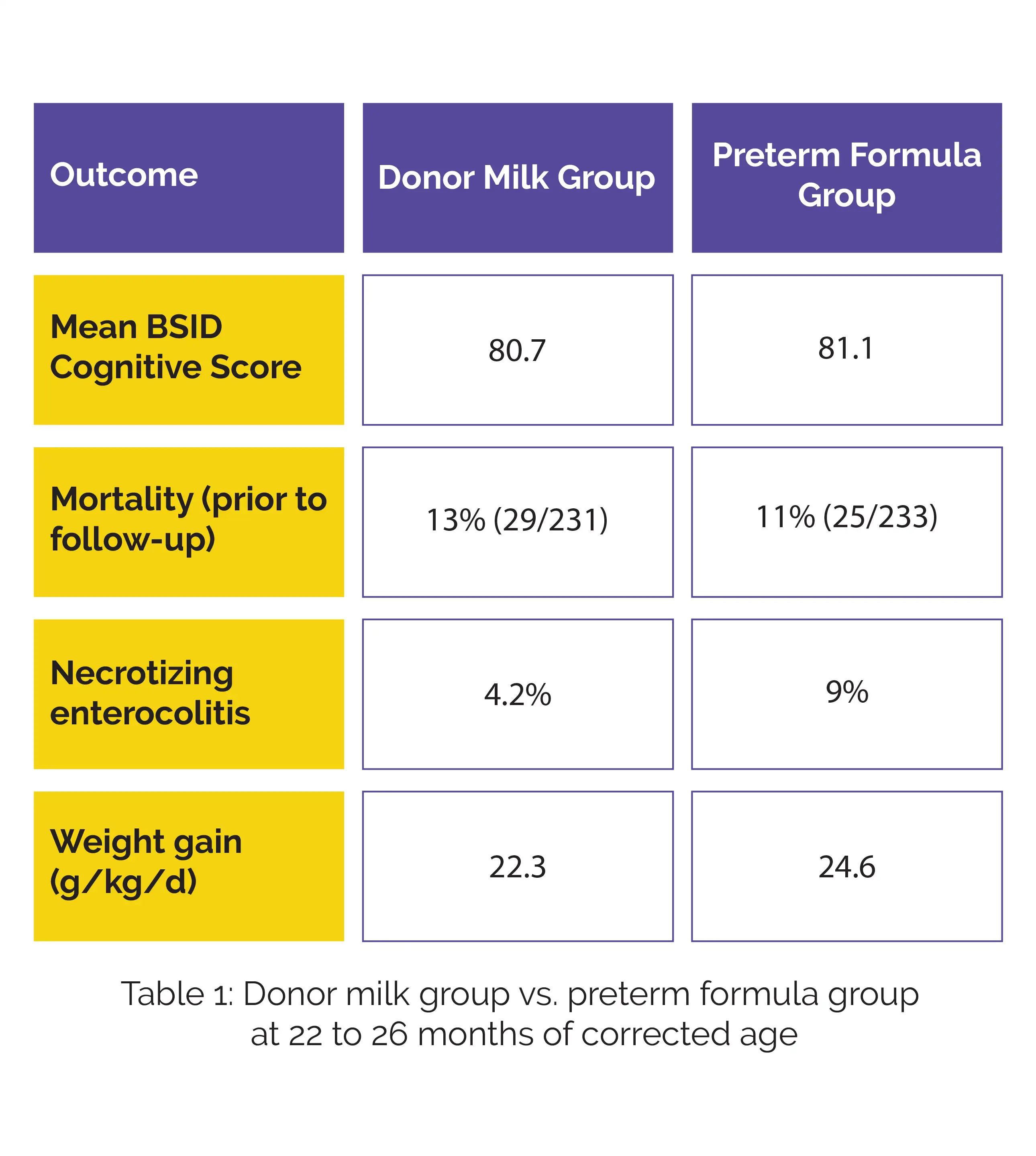 The study found no vital differences in cognitive development between the donor milk group and the preterm formula group. Secondary endpoints, including BSID language and motor skills, were also similar between the study groups. Additional secondary outcomes, such as mortality, incidence of necrotizing enterocolitis, and weight gain, are detailed in Table 1 below.