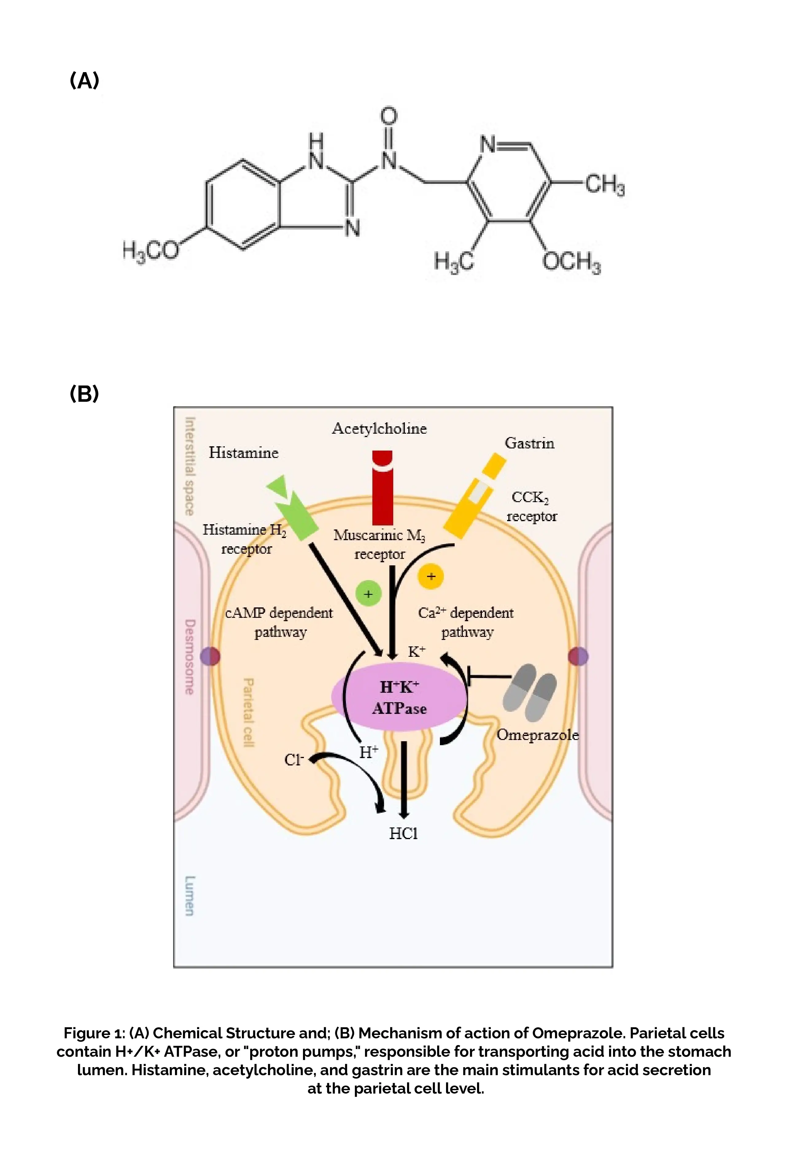 Omeprazole, a proton pump inhibitor, is a weak base with a pKa of 4.0. After being absorbed in the intestine, it travels through the bloodstream and reaches the parietal cells of the stomach. Omeprazole is not charged at a pH of 7 and can cross cell membranes. However, in the secretory canaliculus of actively secreting gastric parietal cells, where the drug is exposed to a pH of less than 2, Omeprazole becomes protonated and is converted to the active form, a sulfenamide that reacts covalently with the sulfhydryl groups of cysteine residues on the extracellular surface of the alpha subunit of the H(+)/K(+)-ATPase and inhibits the activity of the enzyme (Figure 1B).