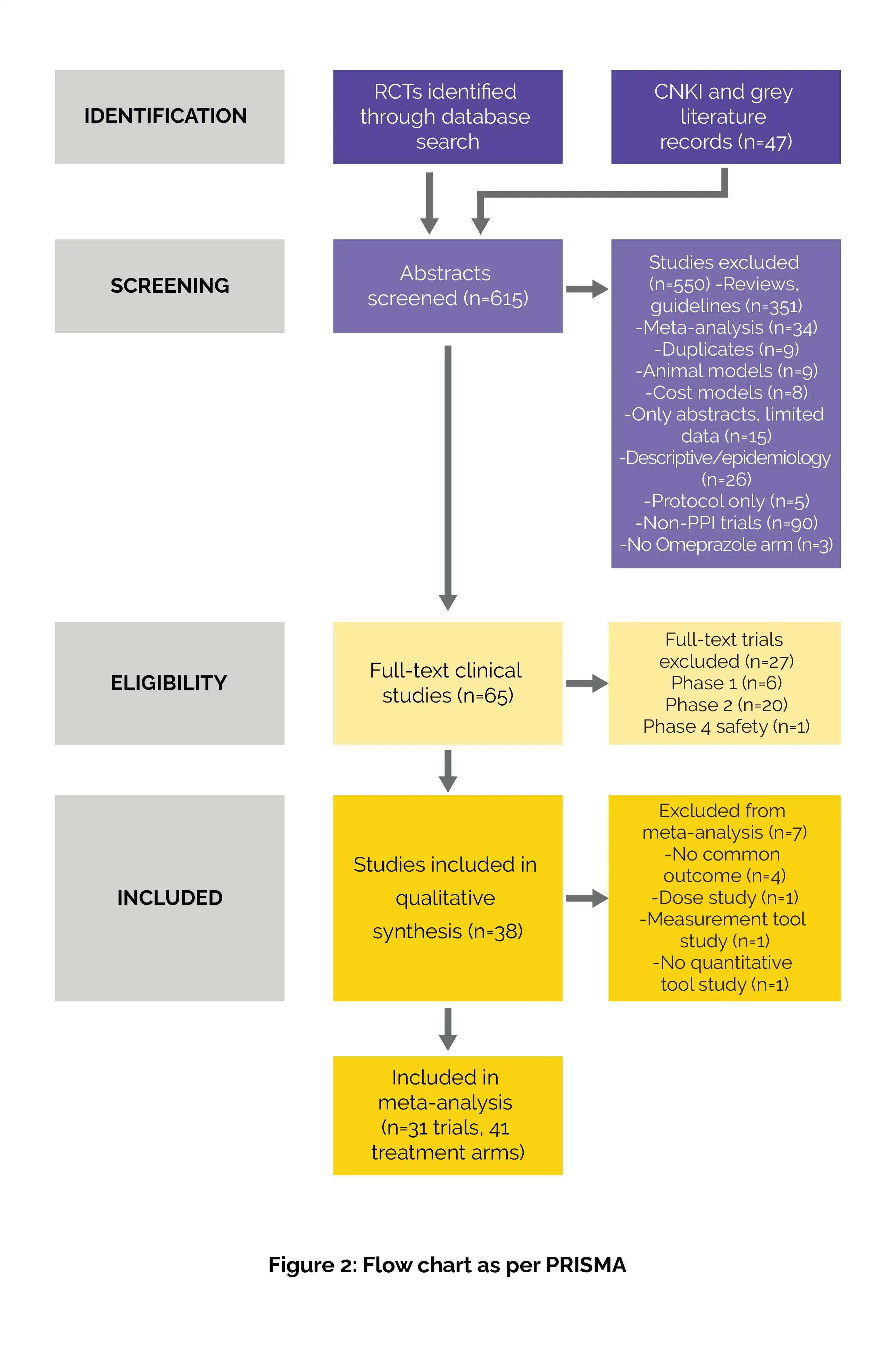 To be included in the meta-analysis, studies required at least two RCTs or cross-over trials with a common outcome measure by control type (placebo or the same type of PPI). Stata software version 16 was used to generate forest plots and conduct statistical analysis. For significant heterogeneity levels (I2 ≥ 50%), meta-analysis was conducted using Bayesian random effects models, otherwise fixed-effect models were used.