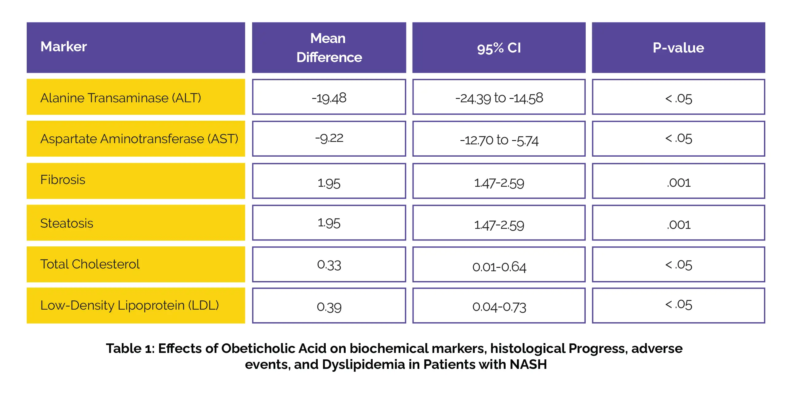 OCA demonstrated a reduction in various liver test markers compared to the placebo. An improvement in balloon degeneration, fibrosis, steatosis (fat build-up in the liver) and lobular inflammation with OCA was also noted. This treatment was linked with increased levels of total cholesterol and low-density lipoprotein and pruritus severity with higher doses.