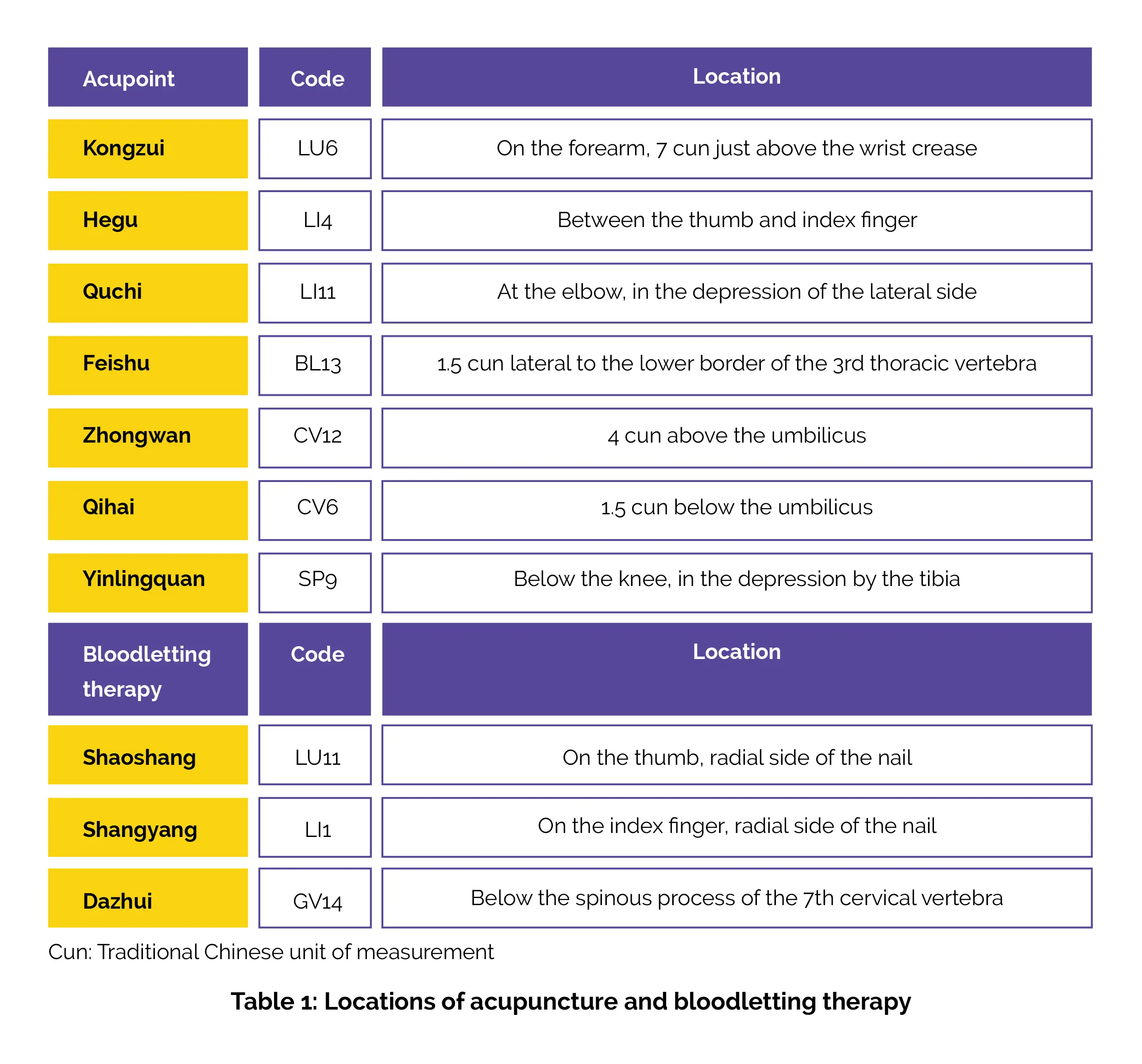 • Intervention group: 50 patients received acupuncture combined with bloodletting in addition to Qingwen Xiere decoction, along with the acupuncture administered 30 minutes every day for six days and bloodletting administered every other day three times. Details of the locations have been described in Table 1: