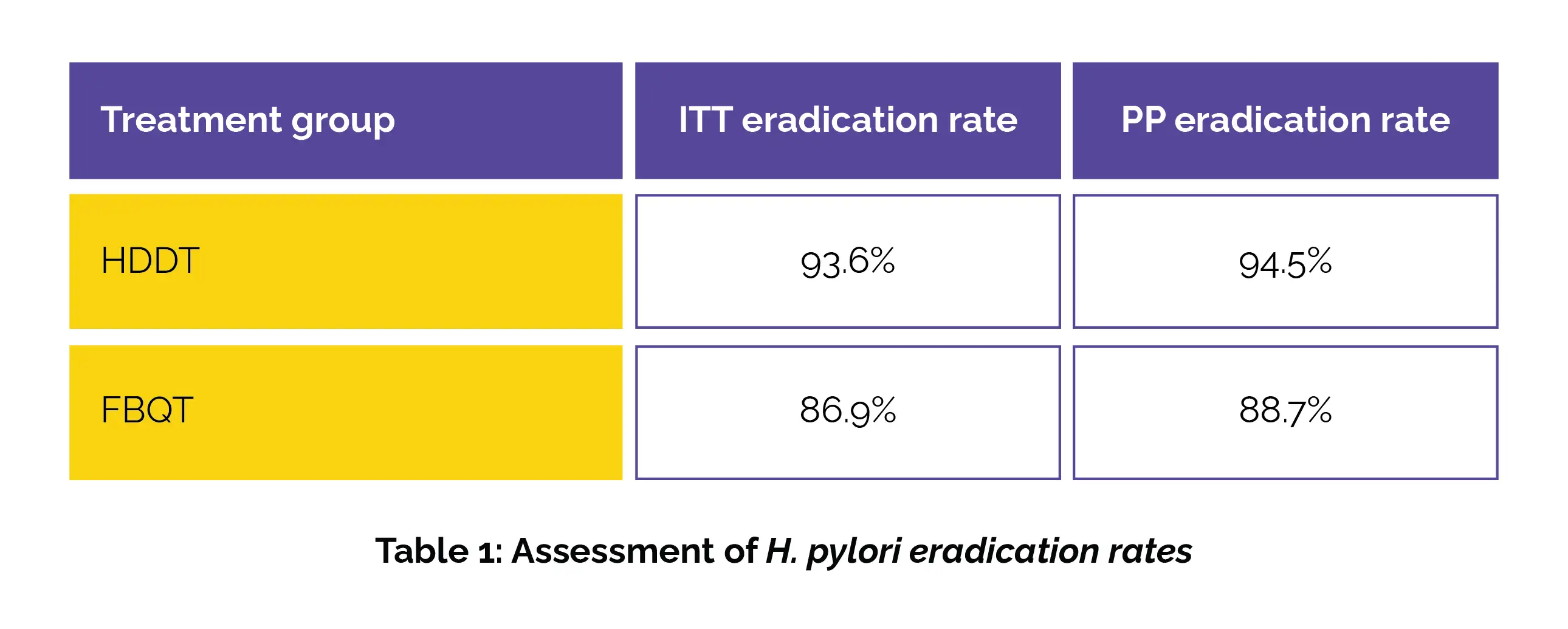 In the intention-to-treat (ITT) and per-protocol (PP) analysis, the eradication rates did not vary significantly amongst the groups after 14 days, as shown in Table 1: