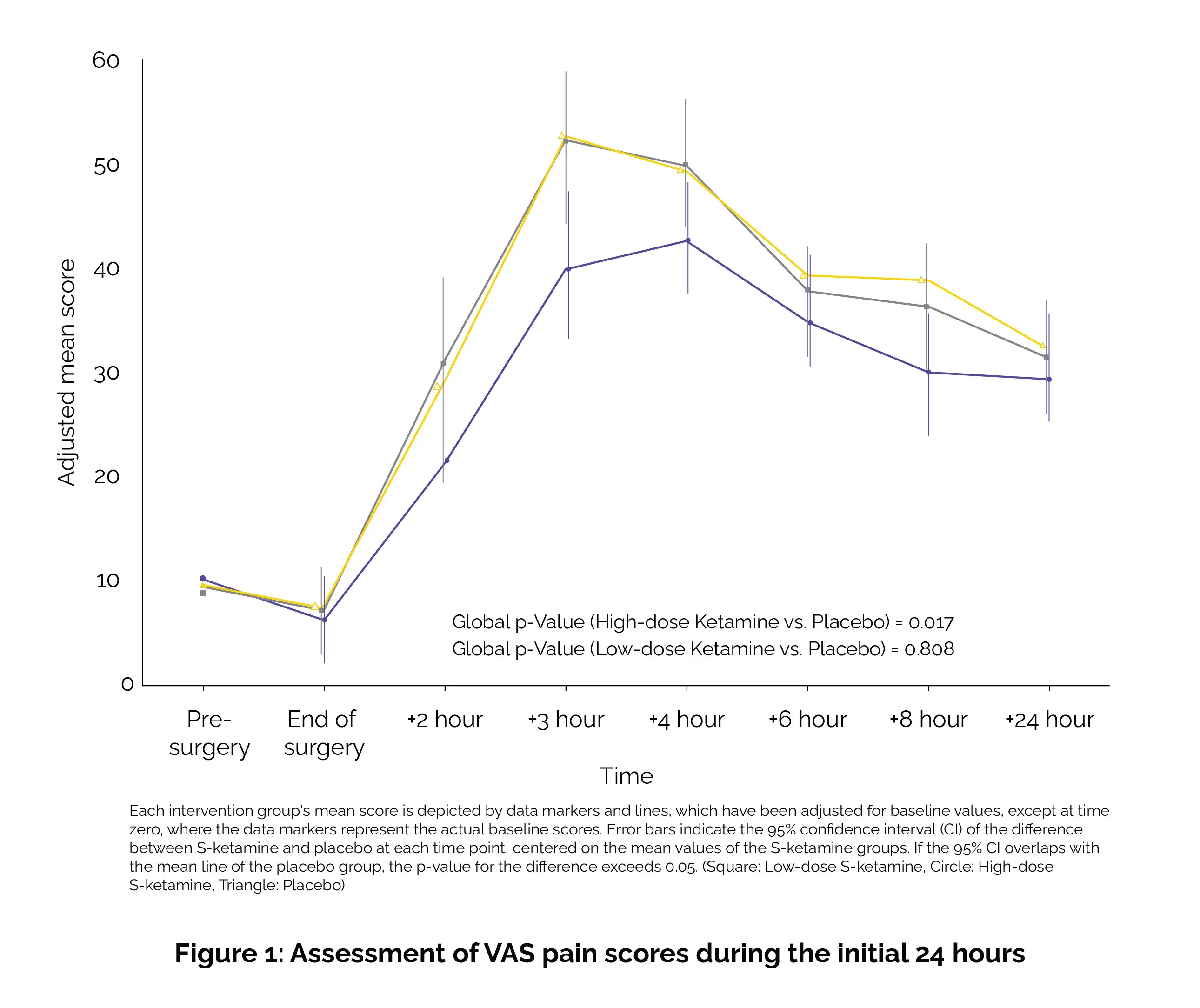 The preemptive administration of S-ketamine at a dose of 0.25 mg/kg led to a noteworthy reduction in overall pain, as assessed by VAS, during the initial 24 hours following surgery. Additionally, patients in the high-dose ketamine group experienced a prolonged interval between the end of surgery and the initial need for rescue medication compared to both the low-dose ketamine and placebo groups.