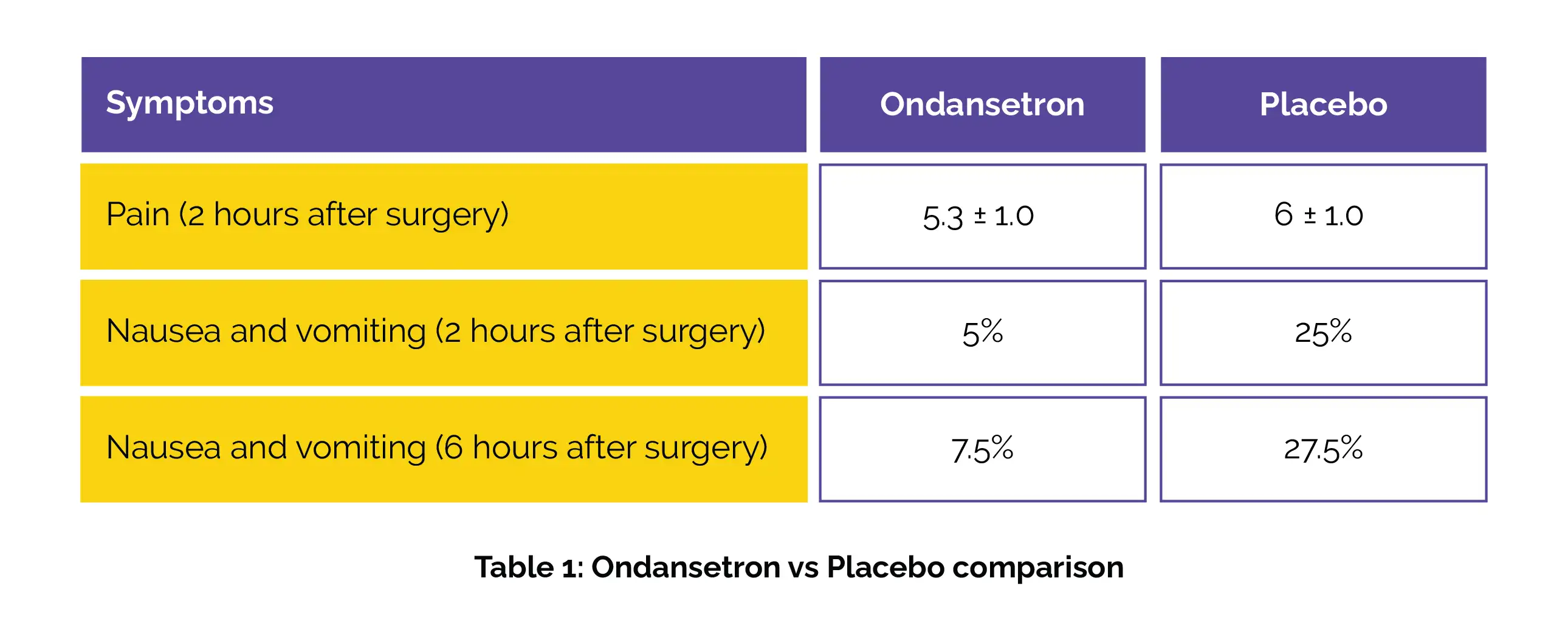 Compared to placebo, Ondansetron markedly reduced pain only at 2 hours post-surgery and nausea and vomiting at 2 and 6 hours, as shown in Table 1 below.