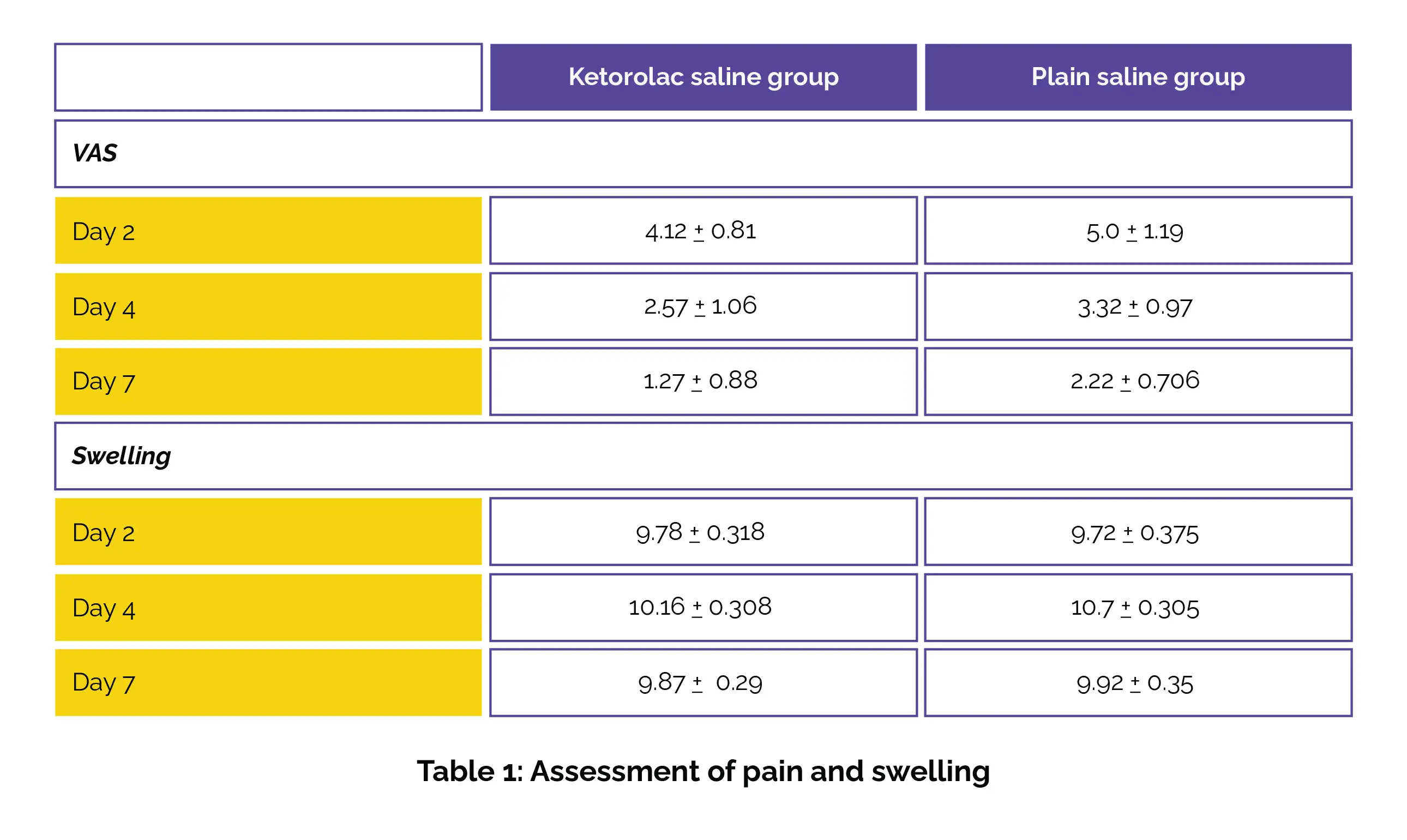 Those in the Ketorolac saline group experienced markedly lower postoperative pain scores when compared to those in the plain saline group (P=0.001). Although swelling was also reduced in the Ketorolac saline group, the difference was not statistically significant by day 7 (P=0.09), as shown in Table 1: