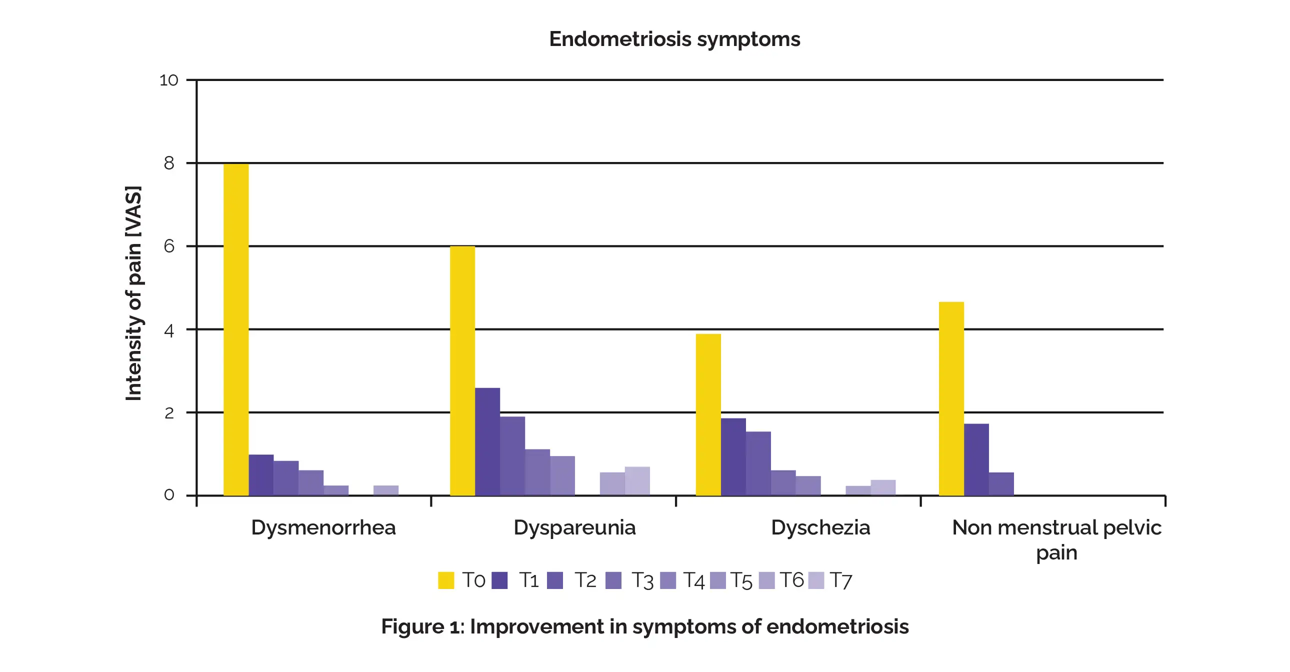 Results illustrated a progressive drop in the size of major endometriomas from 33.2 mm to 7 mm after 108 months. Substantial improvements were witnessed in dyschezia, dyspareunia, dysmenorrhea, and non-cyclic pelvic pain (Figure 1).