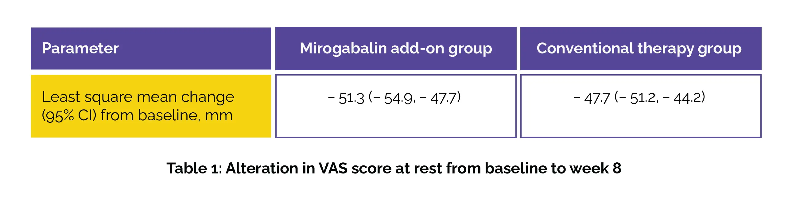Patients diagnosed with peripheral neuropathic pain were randomly allocated in a 1:1 ratio to receive either Mirogabalin in addition to conventional therapy or conventional treatment alone. Out of 131 consenting volunteers, 128 were randomly allocated (63 in the Mirogabalin add-on arm and 65 in the conventional treatment arm). Alteration in pain from baseline to week 8, estimated by visual analogue scale (VAS) at rest was the key outcome.