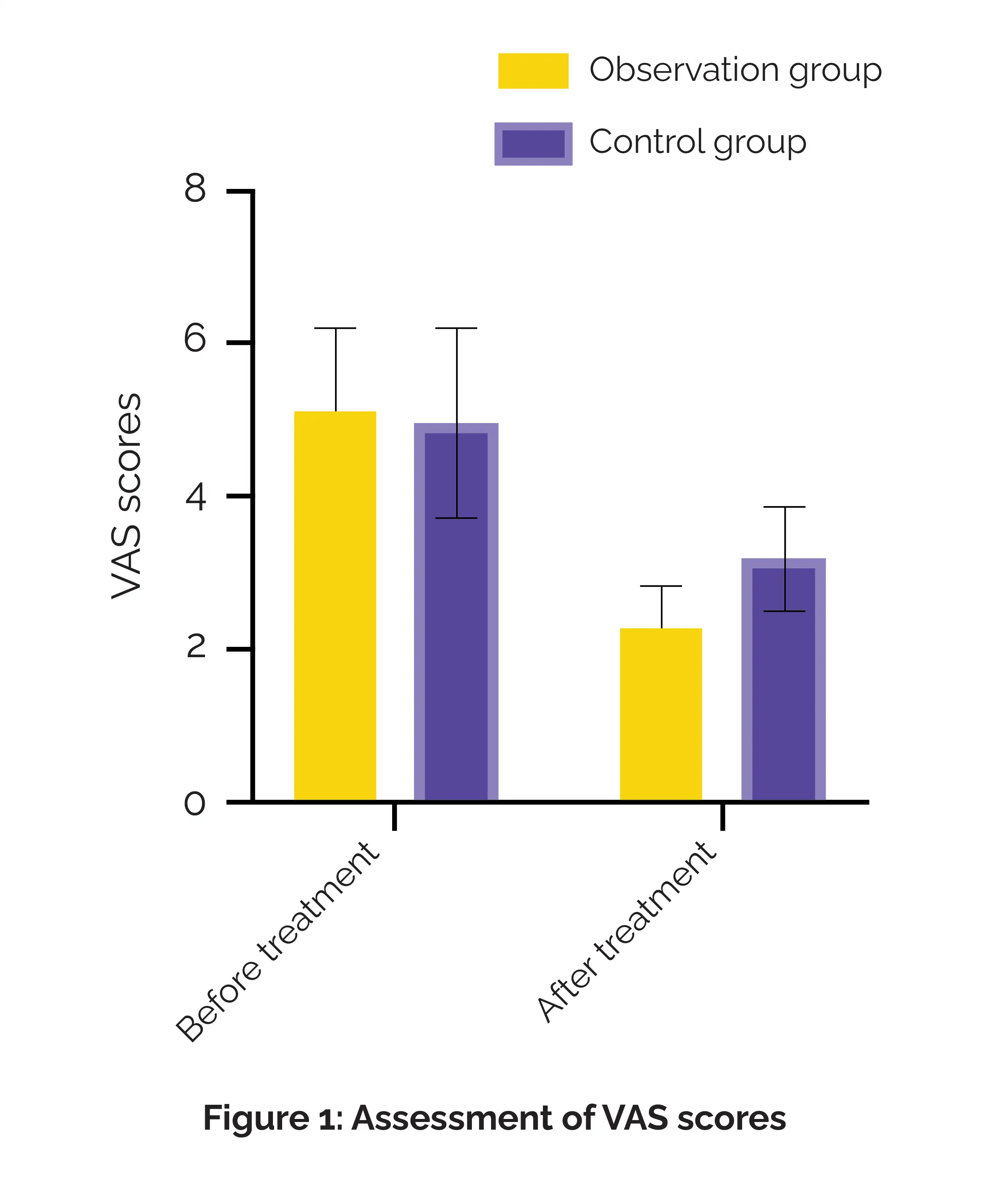 As opposed to the control group, the observation group exhibited a markedly better overall response rate. Post-treatment Harris Hip Scores were quite higher in both groups, with the observation group illustrating greater improvement. In this retrospective study, the VAS scores dropped in both groups, with a more drastic decline in the observation group (Figure 1).